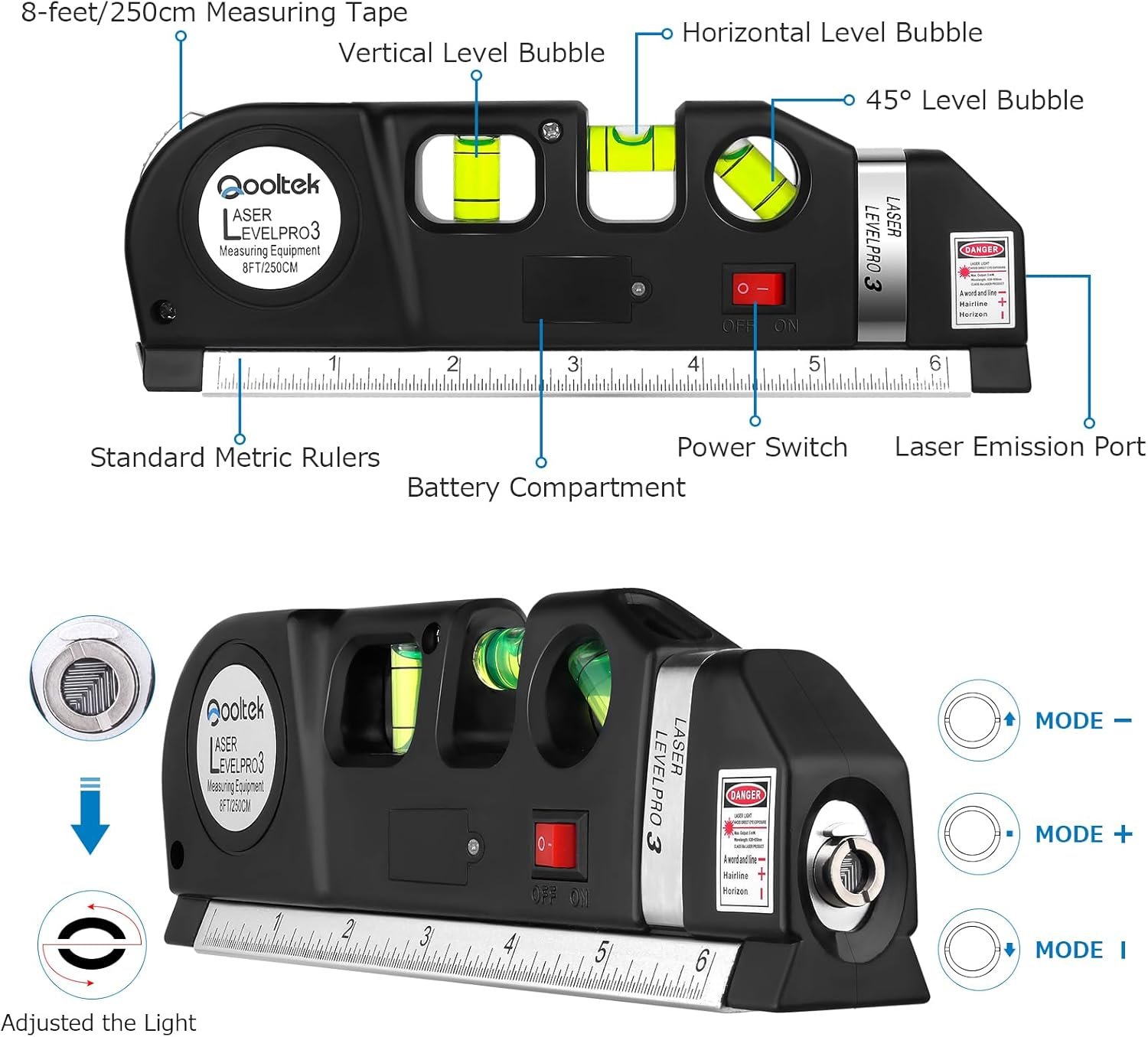 Laser Level Multi Tool, Multipurpose Cross Line Laser leveler Kit Tools with Metric Rulers 8ft/2.5M for Hanging Pictures Cabinets Tile Curtains Walls by Qooltek