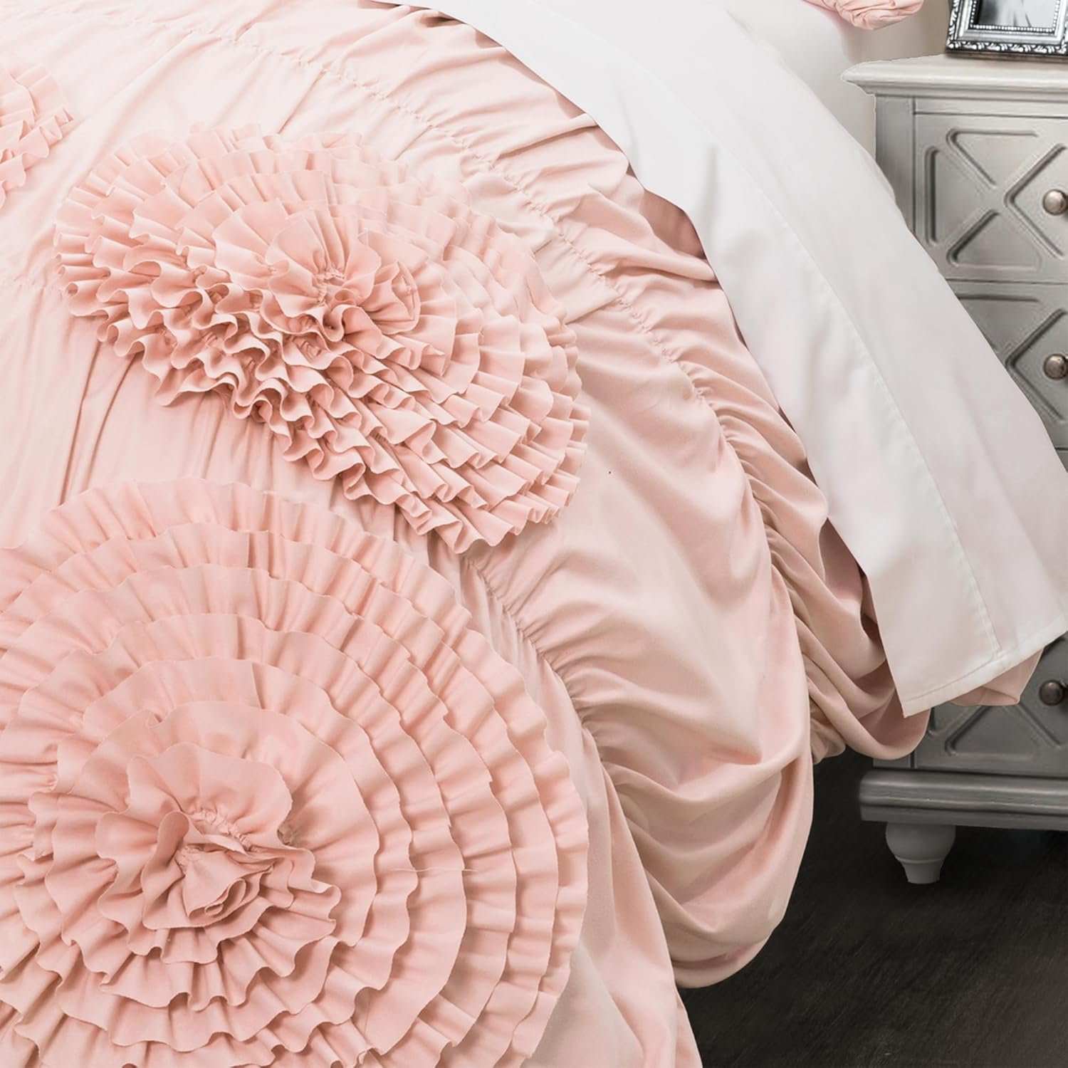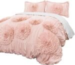 It’s so beautiful in person. I can not stress. Peoples videos did it no justice. I love it. The onlyyy reason why I had to rate it four stars is because of the material used to create the pillow cases. A small part singed in the dryer. I’ve never had that experience with pillows and comforters before. It told me it was cheap material. But the comforter is perfect. It’s lightweight and fluffy, yet thick enough to keep you warm. I would say the flowers part is kind of scratchy at times but we are not sleeping on the flower part of the comforter. But we ARE on the pillows. I’ve learned to place them on the side or if I’m too lazy to move the decorative pillows sleep with the petals facing down.