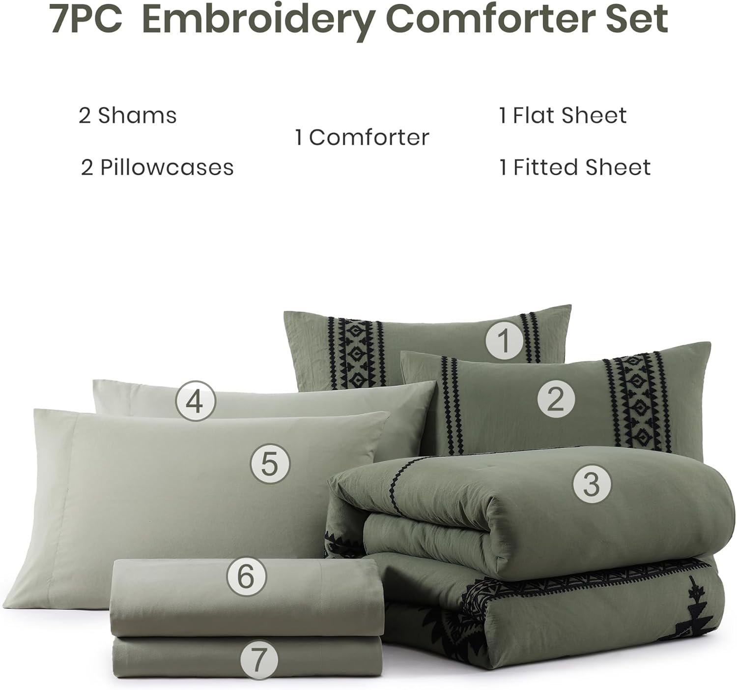MAIREVE Olive Green Embroidery Comforters Set Queen Size – 7 Pieces, Farmhouse Western Bedding All Season Bed in A Bag Queen, Boho Comforter Set with Sheets, Pillowcases & Shams