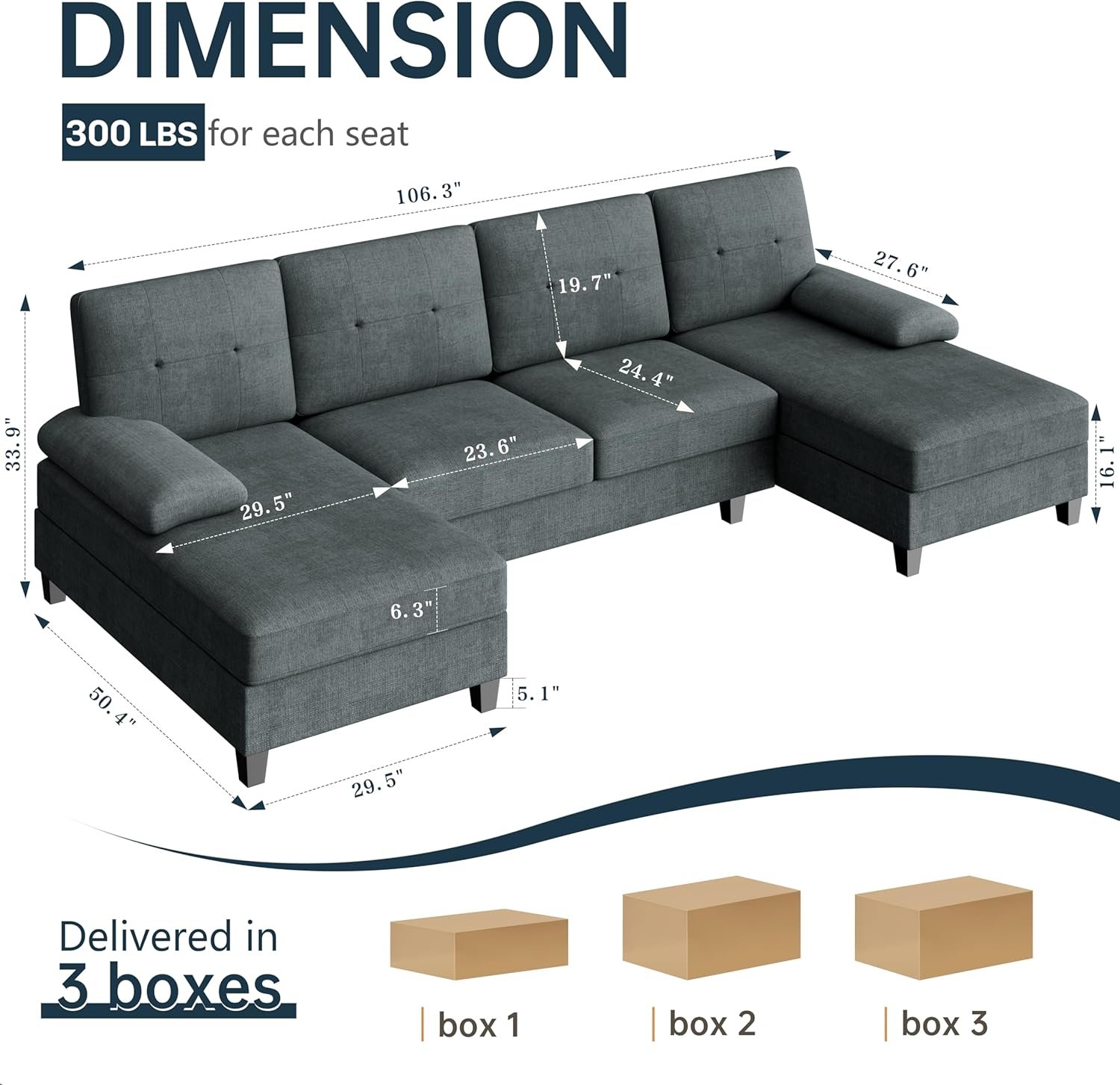3 pieces in being delivered in 3 boxes u definitely need a drill to screw in legs and pillows are vacuum sealed Arms need to be zipped on the sectional couch but I hit dark grey but everything else is light gray but it’s very durable and comfortable firmness is perfect but it took up my whole living room bye the window nice long length