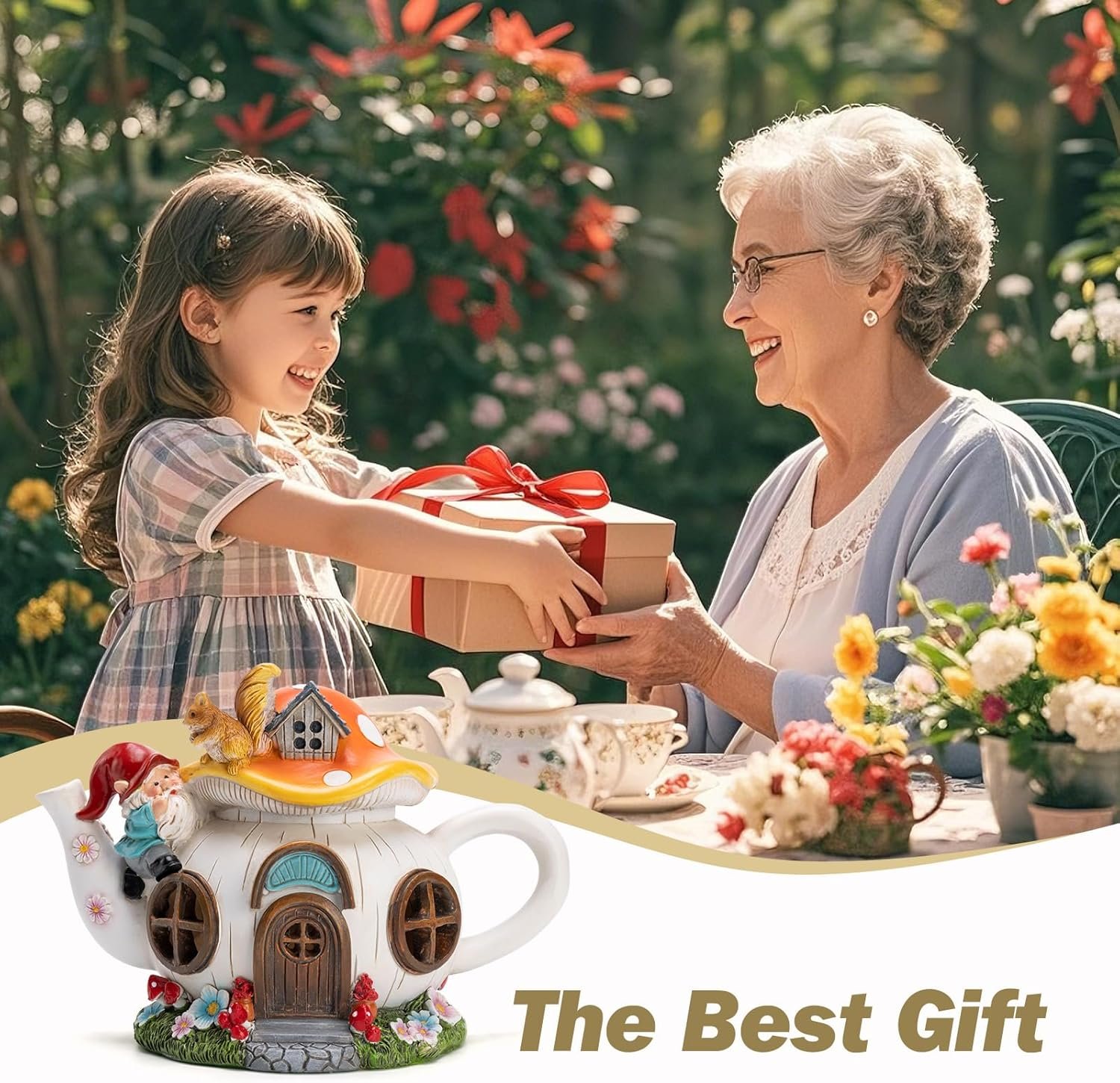 Mushroom Fairy House Garden Decor Solar Light – Outdoor Gnome Statue with Squirrel, Resin Teapot Decorative Figurine for Patio, Lawn, Yard & Balcony, for Women, Mom, and Home