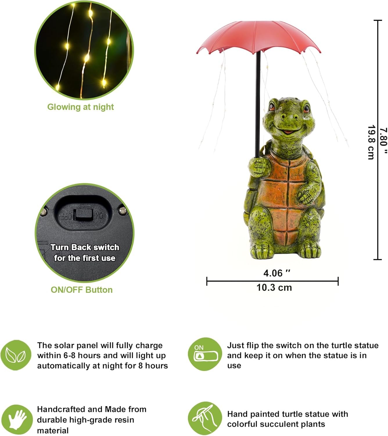 I have several types of solar outdoor statues like this one , so I am familiar with how they work. This one does not light up, but is very cute decor anyhow. I have the switch to the ON position and the solar panel is facing up to receive the sunlight, but nothing for several days now. The turtle is so adorable and a nice heavy weight for a statue. The size is perfect too. The umbrella has the light connections in it for the raindrops to light up. Something must be disconnected. I like it anyhow as during the day, it is very decorative and different. Looks great among plants! It needs to light up though to be a great product.