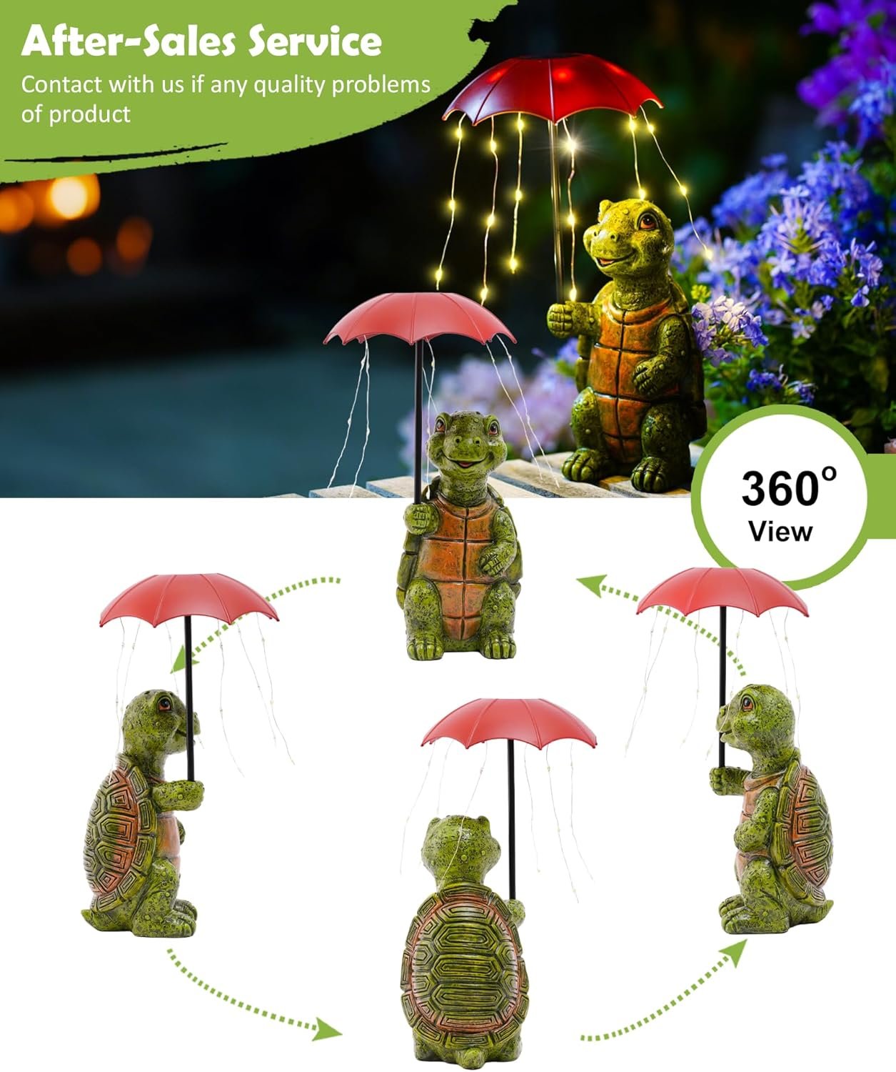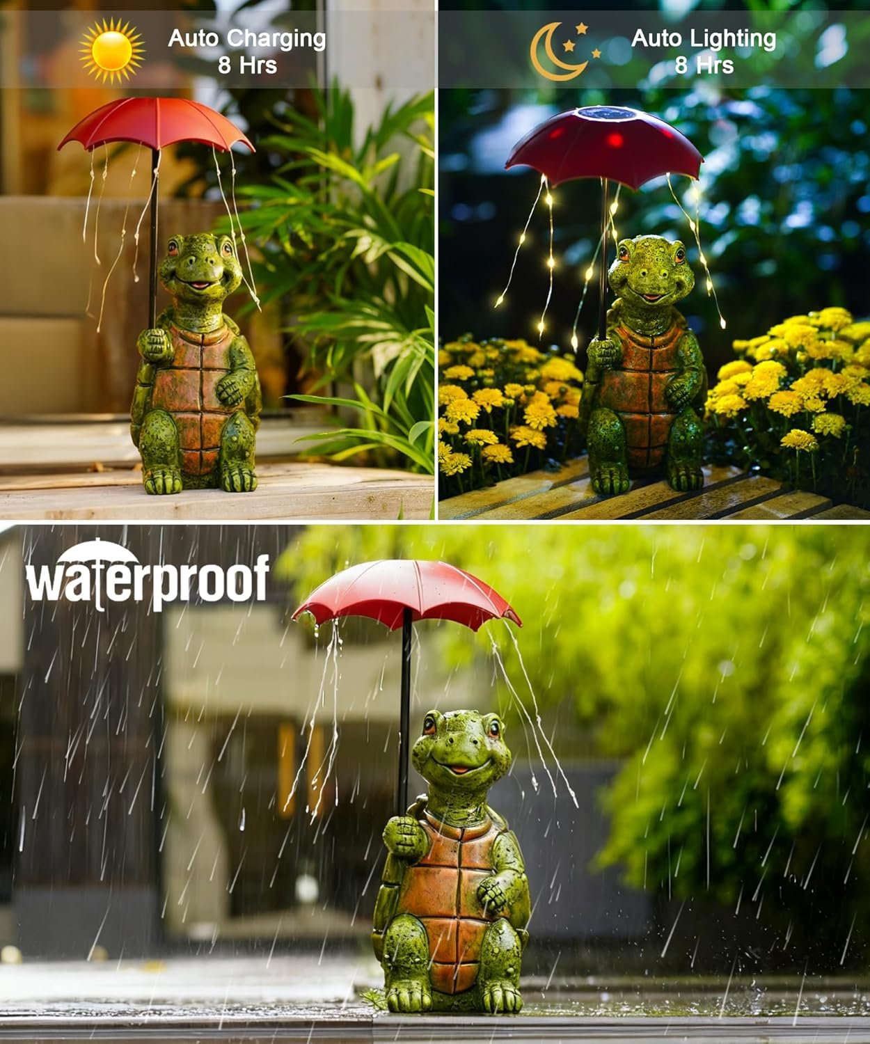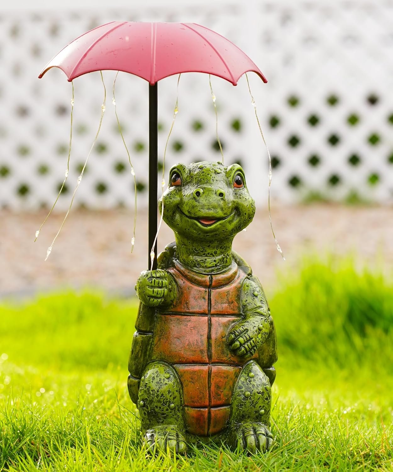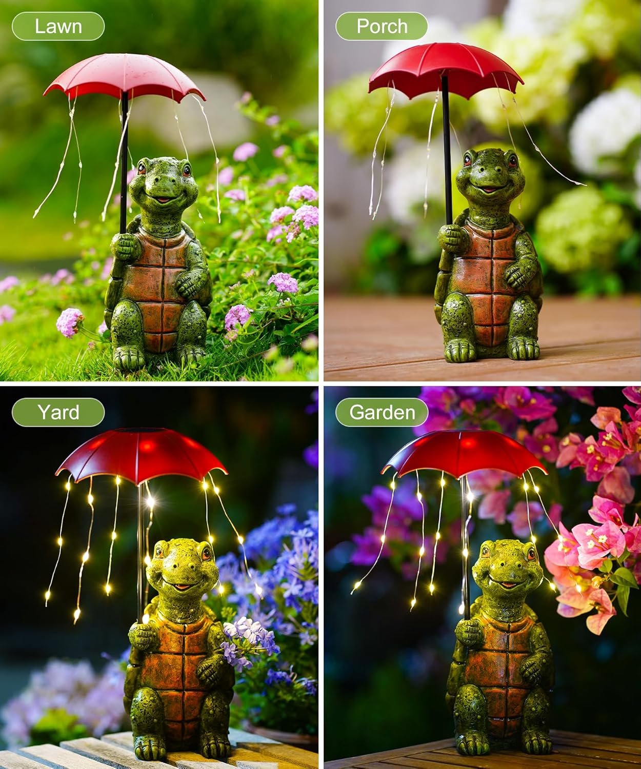 This little solar turtle garden statue is absolutely adorable! The design of the turtle holding an umbrella with string lights makes it such a fun and cheerful addition to my yard. The details are really well done, from the turtle’s happy expression to the textured shell, it looks great during the day and even better when the umbrella lights up at night.The solar panel works well, and it automatically turns on when it gets dark, giving off a soft and warm glow that adds a cozy feel to the garden. It’s also sturdy and weather-resistant, so I don’t have to worry about it when it rains.This would make a wonderful gift for anyone who loves garden decor or whimsical outdoor accents. I got it for myself, but now I’m thinking of getting another one as a gift for my mom, she’d love it too!