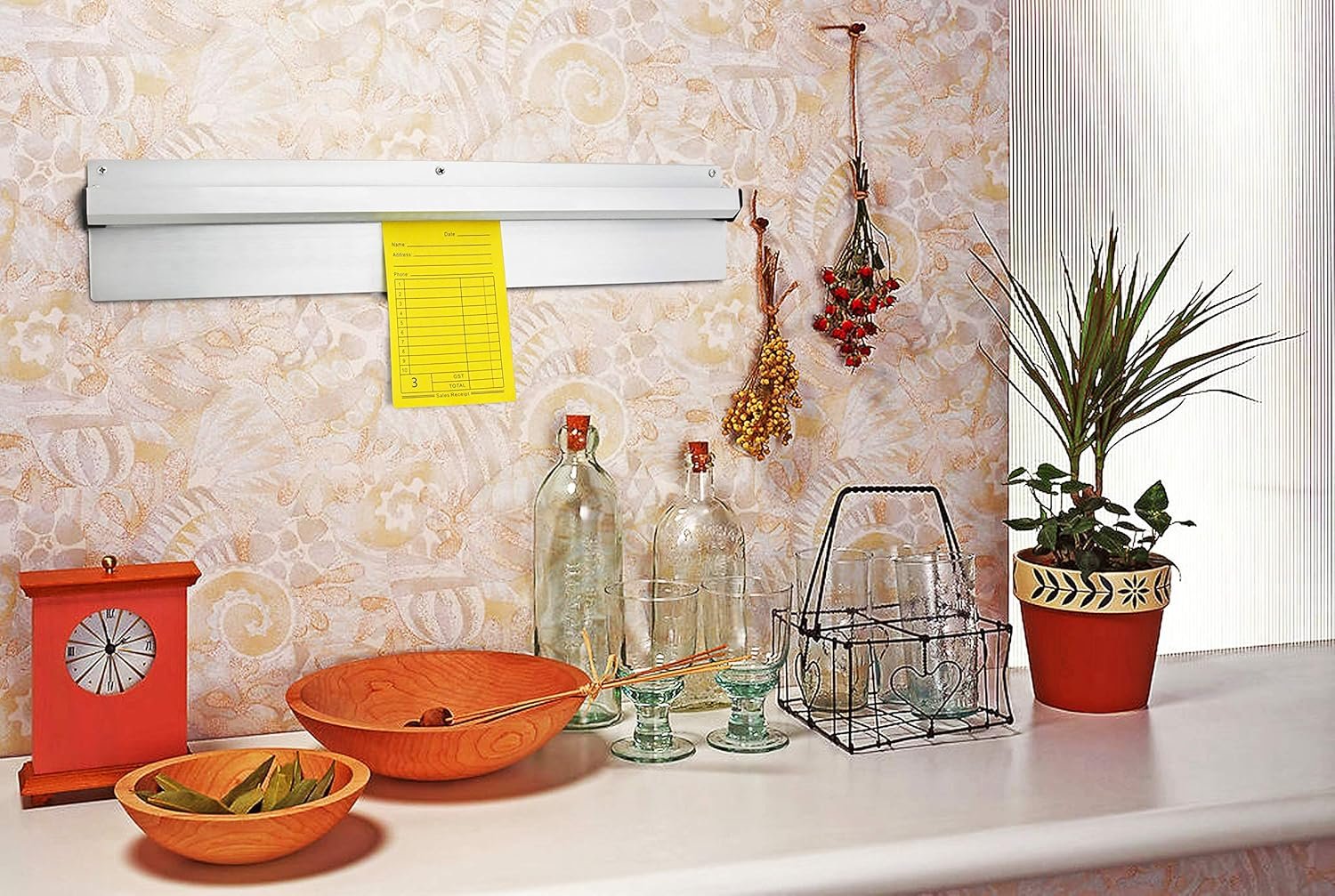 used these in food service for holding customer checks. I bought one for my home kitchen to hold bills, menus and other misc paper work that usually hangs around on counter tops. keeps things up in the air off the surfaces. Installed easily, didn’t come with screws, but I had anchors and screws in my home repair supplies.