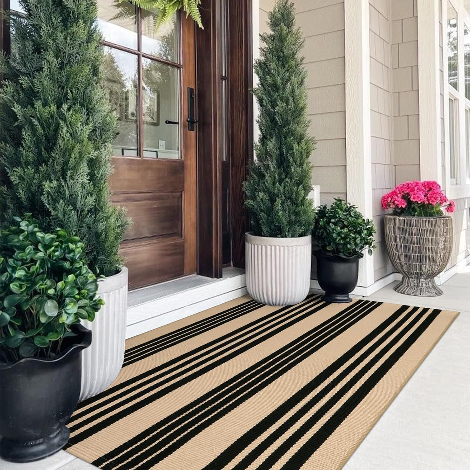 I’m so impressed with this outdoor rug! While it’s a medium weight, it’s the perfect balance — sturdy enough to stay in place with regular foot traffic, yet not overly heavy. It doesn’t feel flimsy at all. I’m using it to layer with a coir fall doormat, and it adds such a stylish, inviting touch to my front entrance. The black and tan design is classic and versatile, and the quality feels outstanding for the price. Highly recommend!