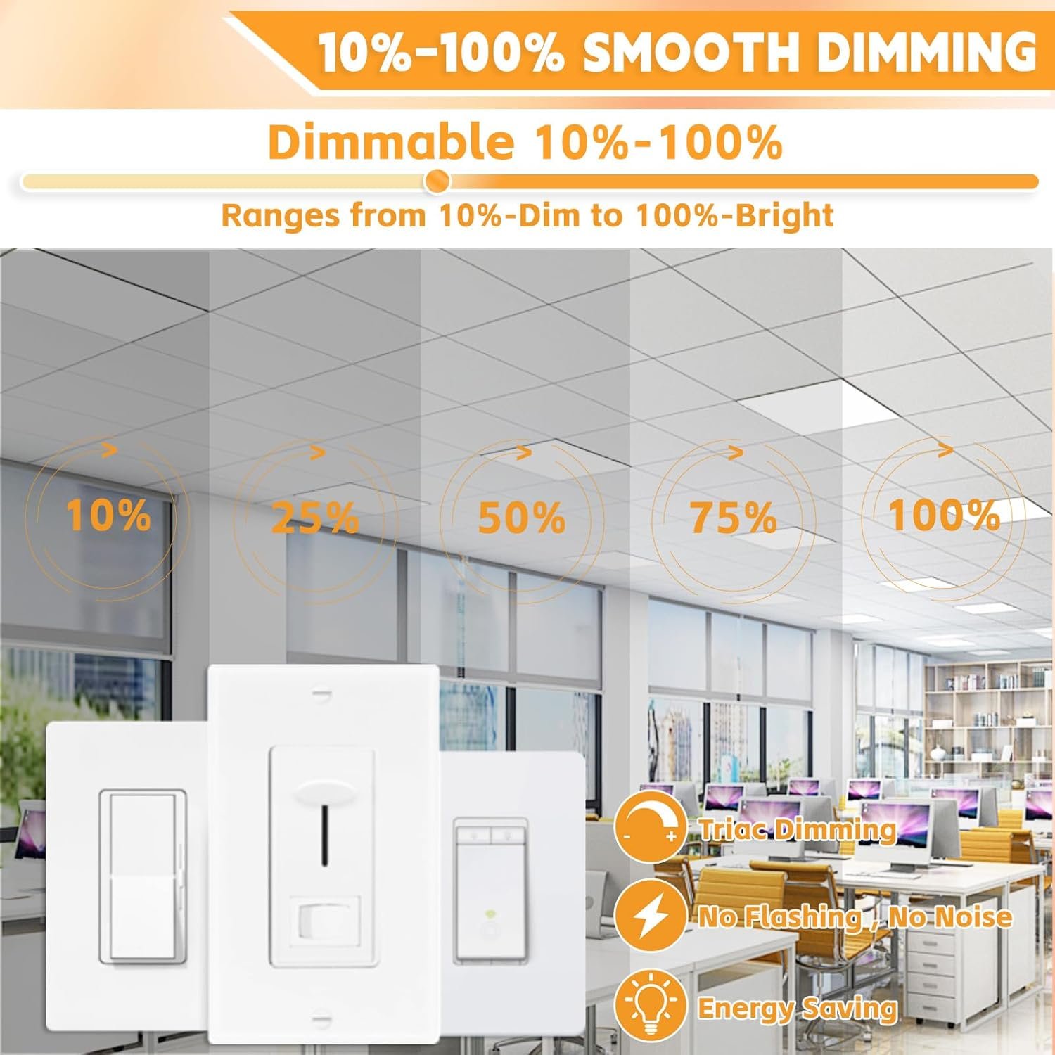 I recently upgraded my office space with this 4-pack of OKQ 2×2 LED flat panel lights, and I’m extremely satisfied with the result.💡 Customizable Brightness and ColorEach panel features a 5-wattage select switch (20W/25W/30W/35W/40W) as well as CCT color temperature options (3000K–6500K), allowing me to fine-tune both brightness and warmth based on the room and time of day (highlighted on page 3 and 4). I opted for 5000K and 35W in my workspace, and the results are clean, crisp, and energizing.🔧 Easy Installation with Recessed MountThe installation process is simple and clearly illustrated with step-by-step diagrams (see page 4). I mounted these directly into my drop ceiling grid and appreciated the compatibility with standard 2×2 openings.🌟 Smooth Dimming PerformancePaired with a TRIAC dimmer (like the Lutron Diva or Leviton models listed on page 4), these lights dim from 10% to 100% smoothly and without flicker. It’s great for creating softer evening ambiance or full-brightness during focused work.🏢 Perfect for Offices, Classrooms, and MoreThese lights are ideal for professional spaces. The brightness ranges (up to 5200 lumens at 40W) make them suitable for even large rooms like classrooms, offices, or warehouses (see examples on page 5).✅ Pros:Wide range of wattage and color temp settingsBright and uniform light outputSolid construction and sleek flush-mount designEnergy efficient with 130 lm/W efficacyEasy install in standard grid ceilings❌ Cons:No included hardware for surface mounting (but expected for recessed panels)Overall:This set exceeded my expectations. It’s powerful, highly adjustable, and looks great once installed. If you need modern, flexible lighting for a large room, this set delivers big time. Highly recommended for office or commercial upgrades .