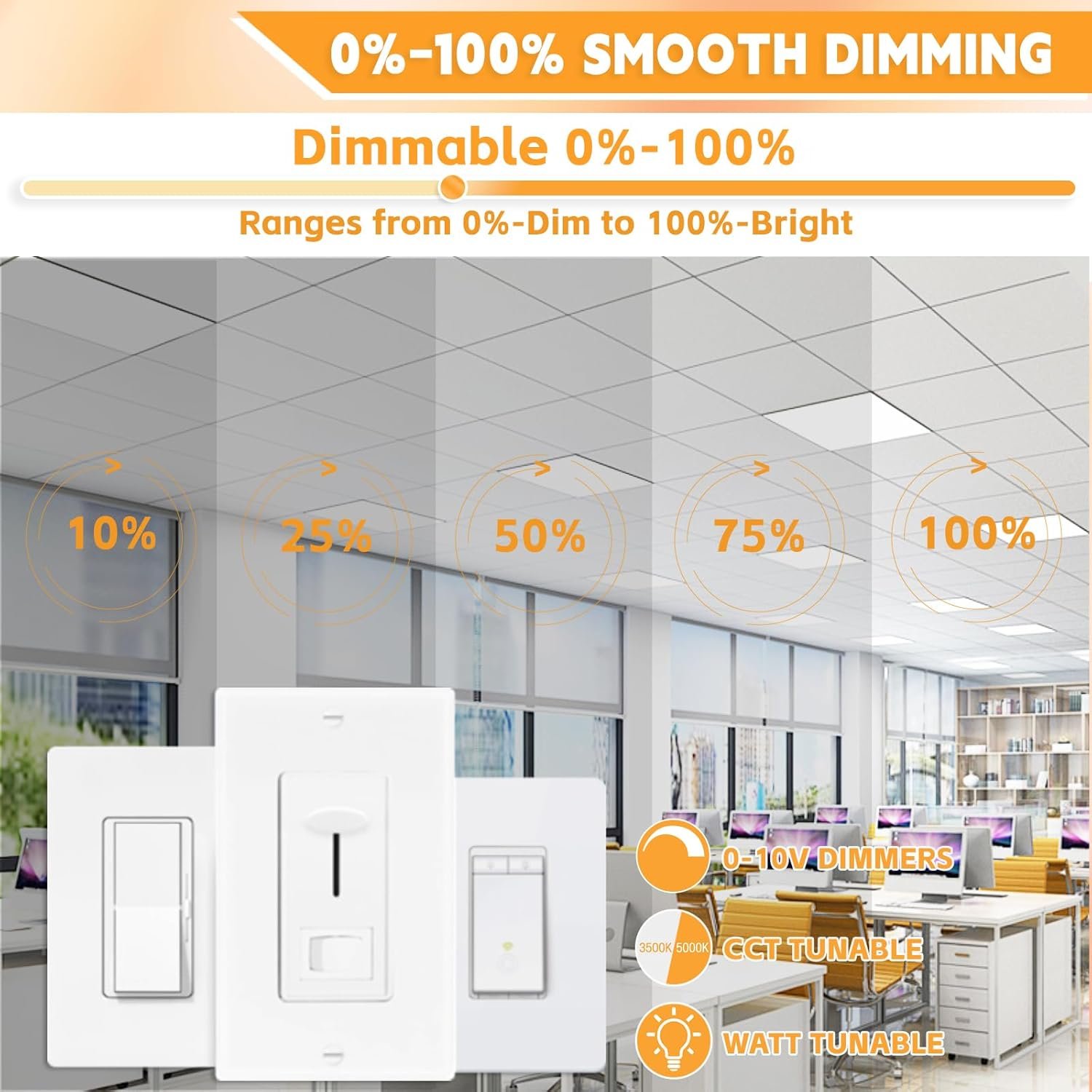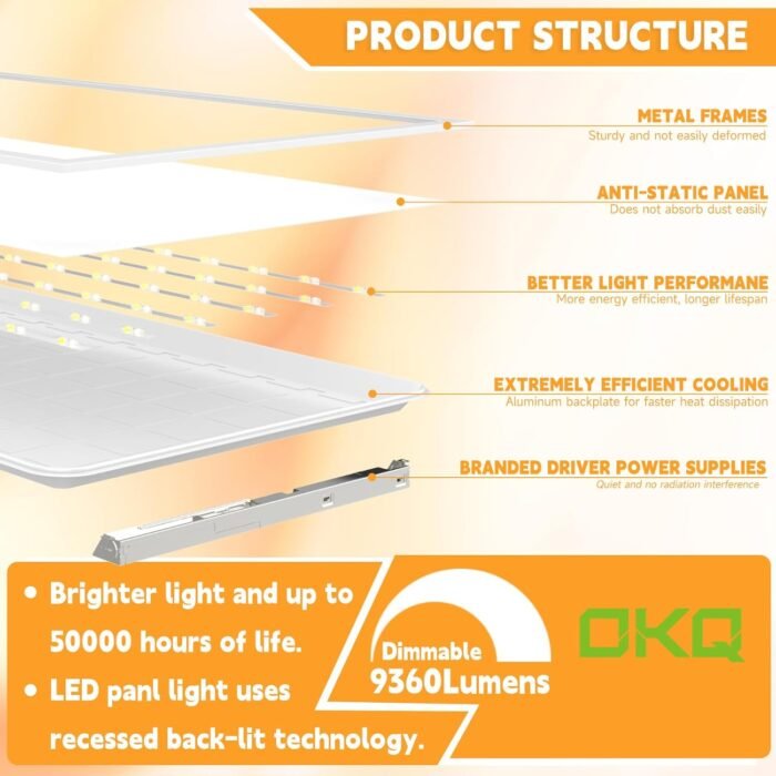 After installing the OKQ 2×2 LED Flat Panel Lights in my office, I am thoroughly impressed with their performance and versatility. The illumination is bright and even—thanks to the high efficacy of 150 lm/W and 6000 lumens output—which makes the entire space feel more alert and productive. Knowing that these lights can last over 50,000 hours and save up to 85% on energy is a huge plus, both economically and environmentally.What really stood out to me was the flexibility in customization. The 5CCT selectable color temperatures (3000K,3500K, 4000K, 5000K,6000K) allowed me to choose the perfect tone for different areas—warmer for break rooms, cooler for workspaces. I also appreciate the option to select between 5 wattages (20W,25W,30W, 35W, 40W), which helps tailor brightness exactly to need. The 0-10V dimming performs flawlessly with no flicker or noise, offering smooth dimming down to 10%, which is ideal for presentations or creating a relaxed atmosphere.The ultra-slim design (only 1.18 inches thick) made installation straightforward, and it integrated neatly into our drop ceiling without protruding. The sealed construction not only looks clean but also prevents dust and insects—a thoughtful feature for long-term maintenance.These lights are ETL and DLC certified, which gave me confidence in their safety and quality. Whether for offices, schools, retail, or healthcare settings, OKQ’s panel lights offer professional-grade performance. Combined with reliable after-sales support, this product truly delivers excellent value. Highly recommended!