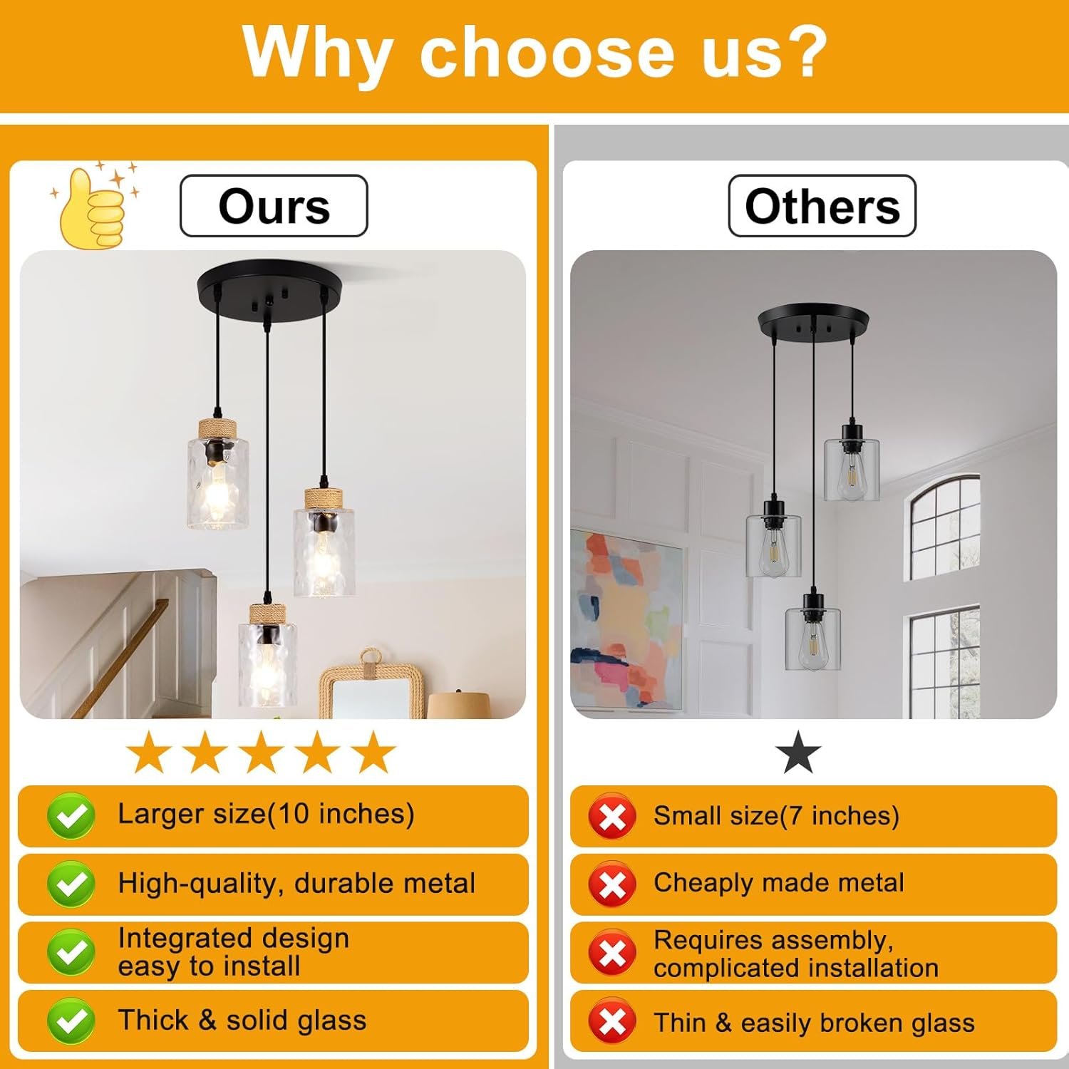 Looks very stylish and modern, yet still cozy — it fits perfectly above my kitchen island. Installation was super easy, everything I needed was included. I love that the light can be dimmed — it’s so convenient! Honestly, I didn’t expect such great quality for this price. Totally recommend.