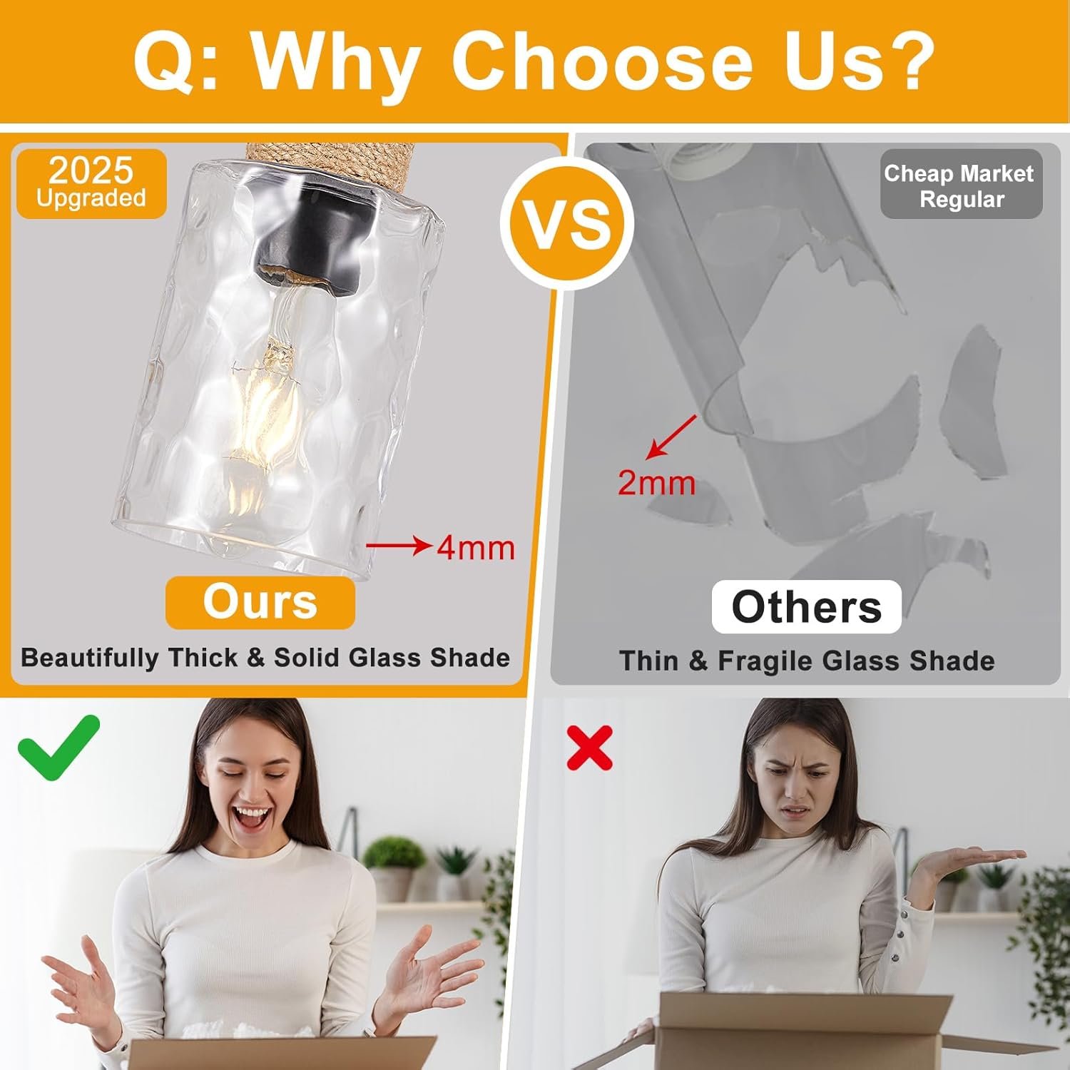 The packaging was perfect, and the item arrived very quickly. The glass shade is good quality for the price as is the hardware. The length is full adjustable. I prefer to use Edison style bulbs in them at varying brightness and have always been satisfied. The light quality on this is fine and as expected. Will continue buying lights from this maker as we work on more houses. Worth buying!