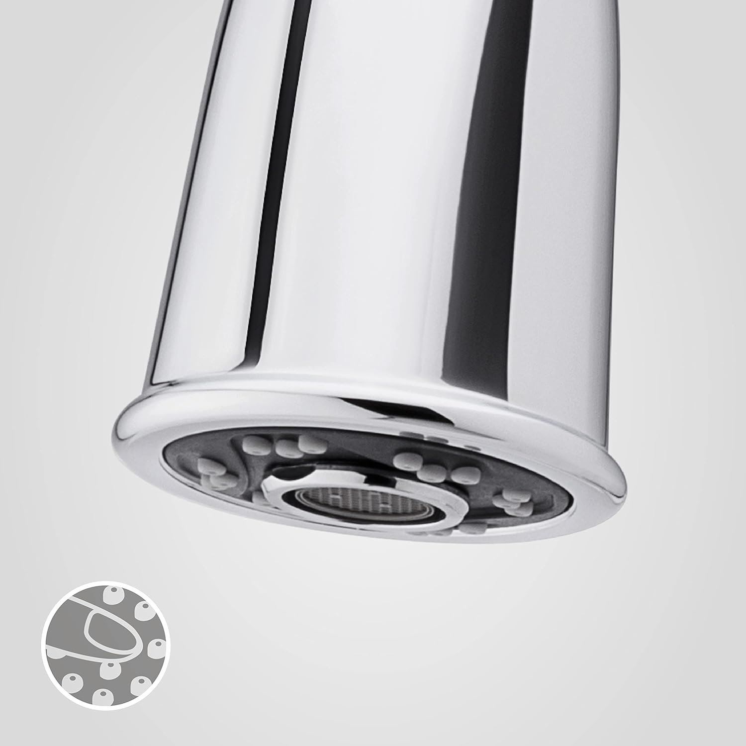 Very attractive faucet. The two types of spray and the swivel are great. However, the weight that attaches to the hose for the pull-down feature is large and clunky. It bounces off of the water pipes and cabinet wall during use. The nozzle drips unless you shake it off after use.