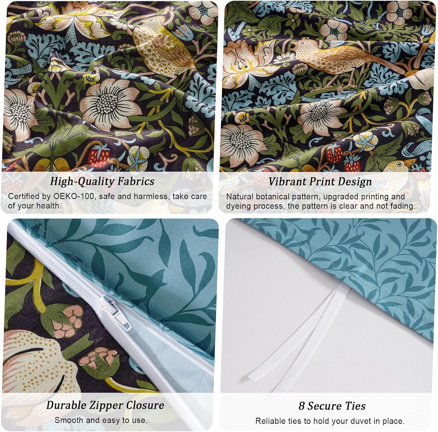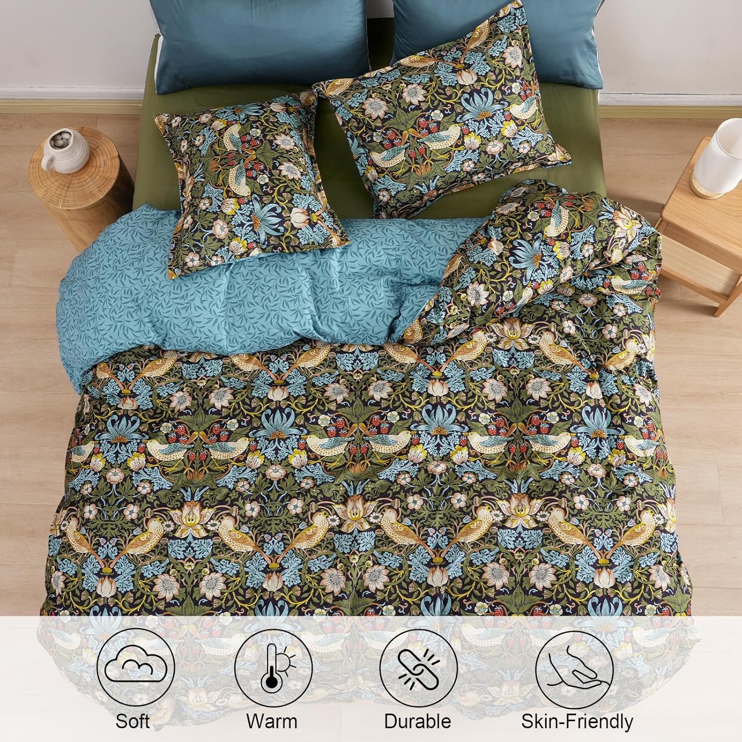 PHF Ultra Soft Floral Duvet Cover Queen Size, Revisible Boho Printed Vintage Bedding Set 3 Pieces, Comfy Durable Morris Garden Duvet Cover Set with 2 Pillow Shams, Zipper Closure and 8 Ties, 90″x90″