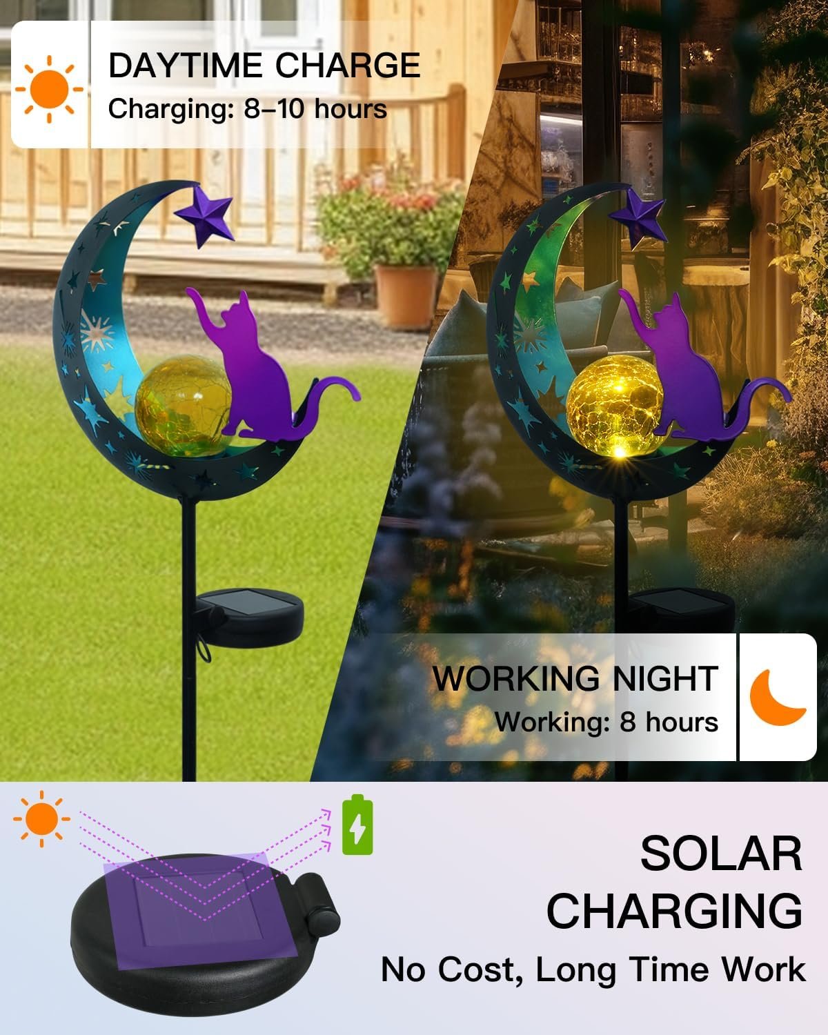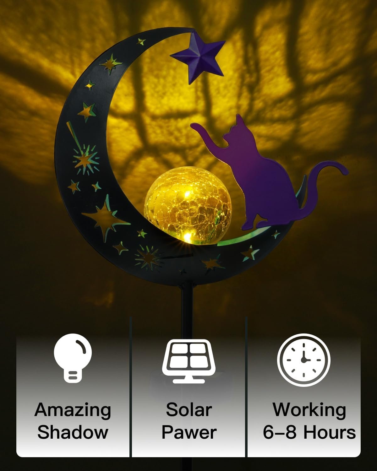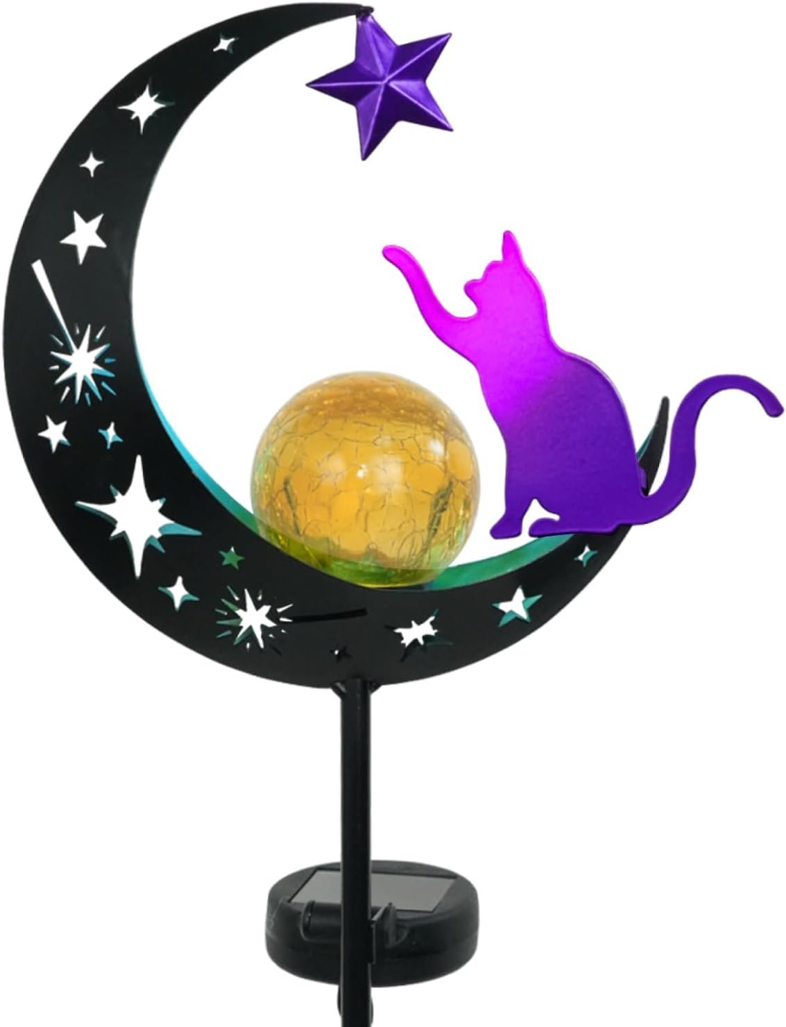 I was really hoping that I would like this ‘Moon Solar Metal Solar Garden Lights Outdoor’. The symbolism of the light…the cat looking up to the moon…really hits home if you’ve ever lost a very special pet. But the poor quality of this item prevents me from doing so.My ‘Moon Solar Metal Solar Garden Lights Outdoor’ arrived broken…the solar panel was snapped off the mounting rod, and I see no feasible way to attach it. It’s just going to have to hang there. Hopefully it gets enough sun to work.The light on this ‘Moon Solar Metal Solar Garden Lights Outdoor’ is very dim. That should be a good thing, because it won’t glare. But it isn’t even bright enough to be able to see what the sculpture is when it’s dark. It’s just an amber globe.I do like the detailing on this light. The coloration is nice, and the actual metal cut-outs look good. And it’s definitely big enough, so it won’t get lost in the greenery.In summary, this ‘Moon Solar Metal Solar Garden Lights Outdoor’ could be a great item if the quality was better. To arrive broken in the carton just tells me it’s cheaply made and nowhere near worth the cost. It’s too bade, because it’s actually quite pretty.