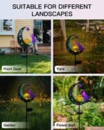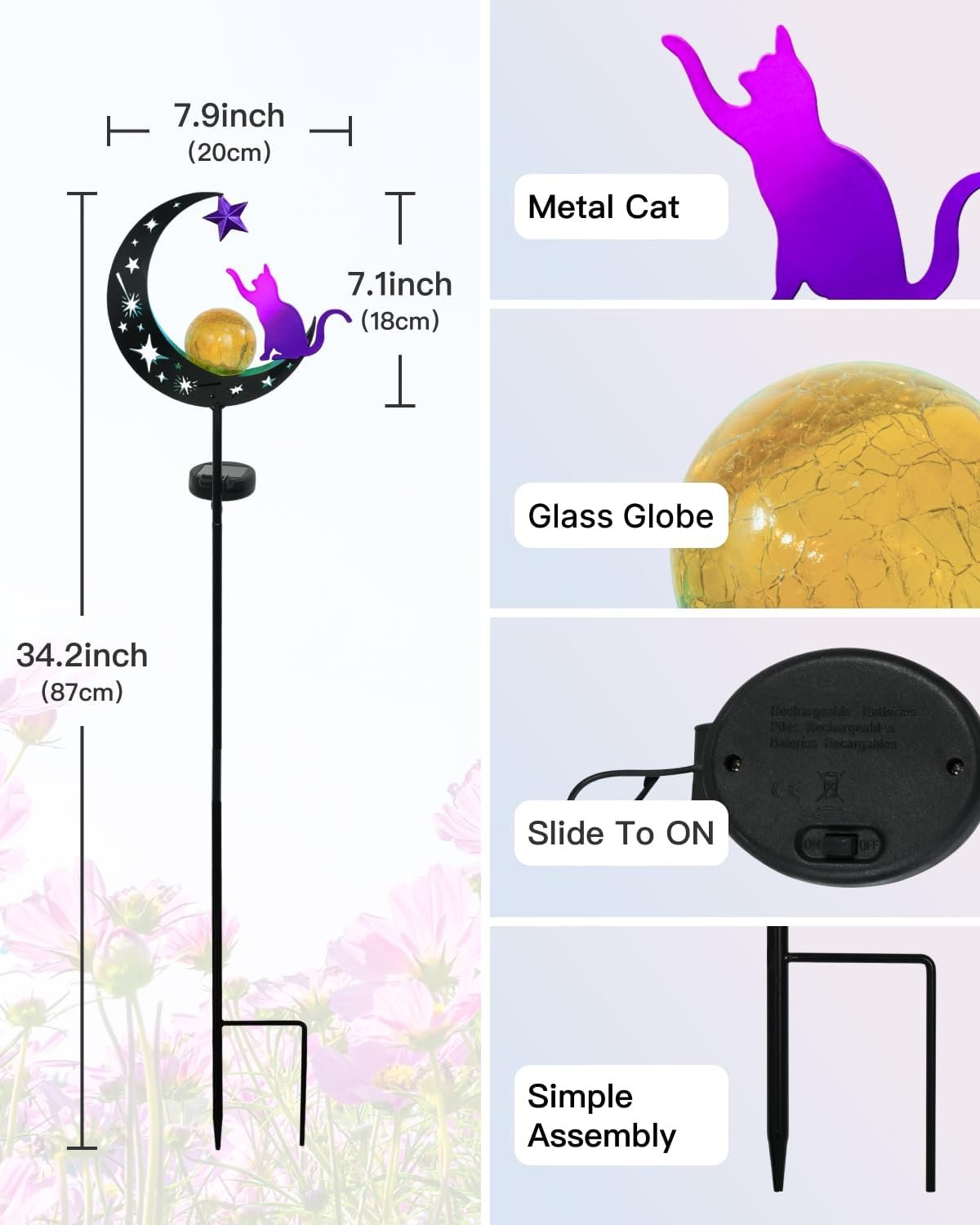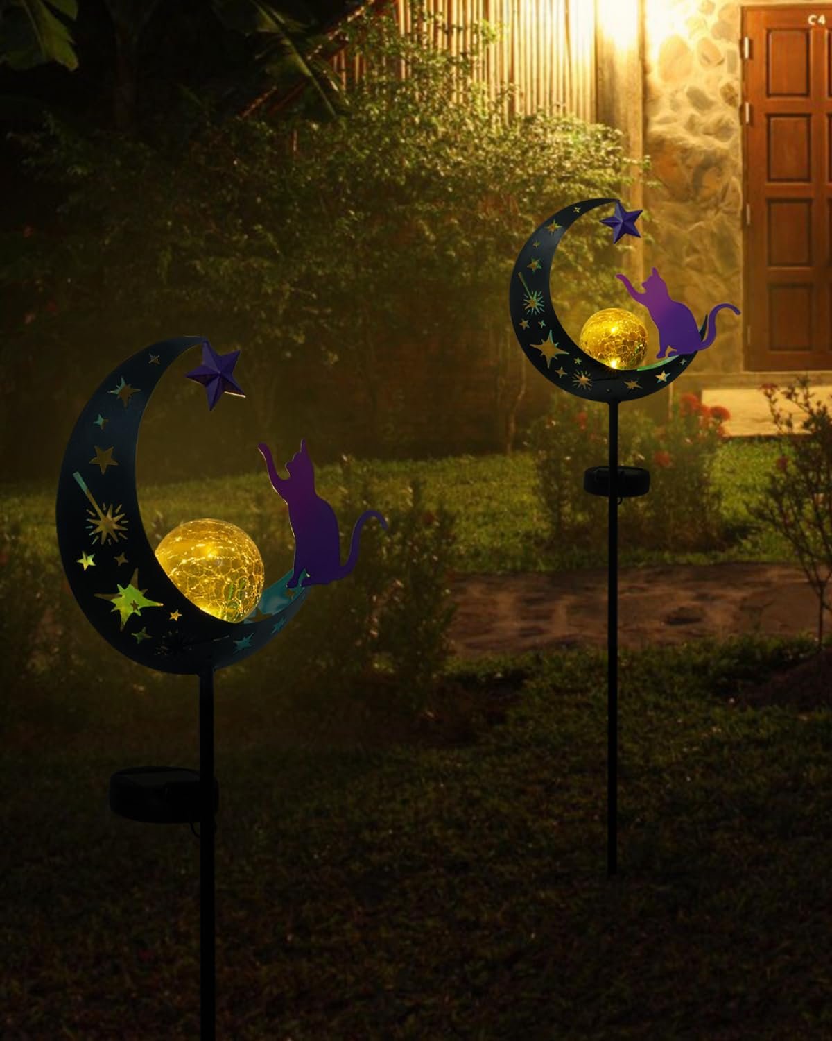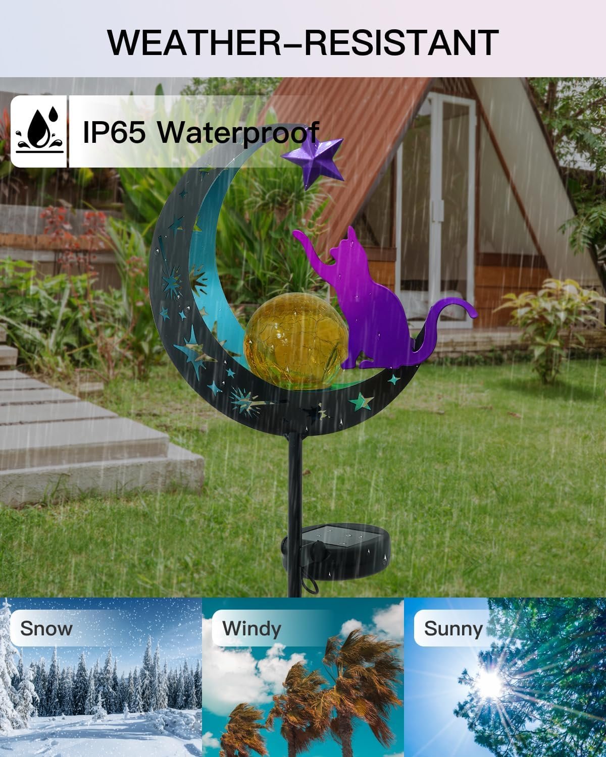 I was really hoping that I would like this ‘Moon Solar Metal Solar Garden Lights Outdoor’. The symbolism of the light…the cat looking up to the moon…really hits home if you’ve ever lost a very special pet. But the poor quality of this item prevents me from doing so.My ‘Moon Solar Metal Solar Garden Lights Outdoor’ arrived broken…the solar panel was snapped off the mounting rod, and I see no feasible way to attach it. It’s just going to have to hang there. Hopefully it gets enough sun to work.The light on this ‘Moon Solar Metal Solar Garden Lights Outdoor’ is very dim. That should be a good thing, because it won’t glare. But it isn’t even bright enough to be able to see what the sculpture is when it’s dark. It’s just an amber globe.I do like the detailing on this light. The coloration is nice, and the actual metal cut-outs look good. And it’s definitely big enough, so it won’t get lost in the greenery.In summary, this ‘Moon Solar Metal Solar Garden Lights Outdoor’ could be a great item if the quality was better. To arrive broken in the carton just tells me it’s cheaply made and nowhere near worth the cost. It’s too bade, because it’s actually quite pretty.