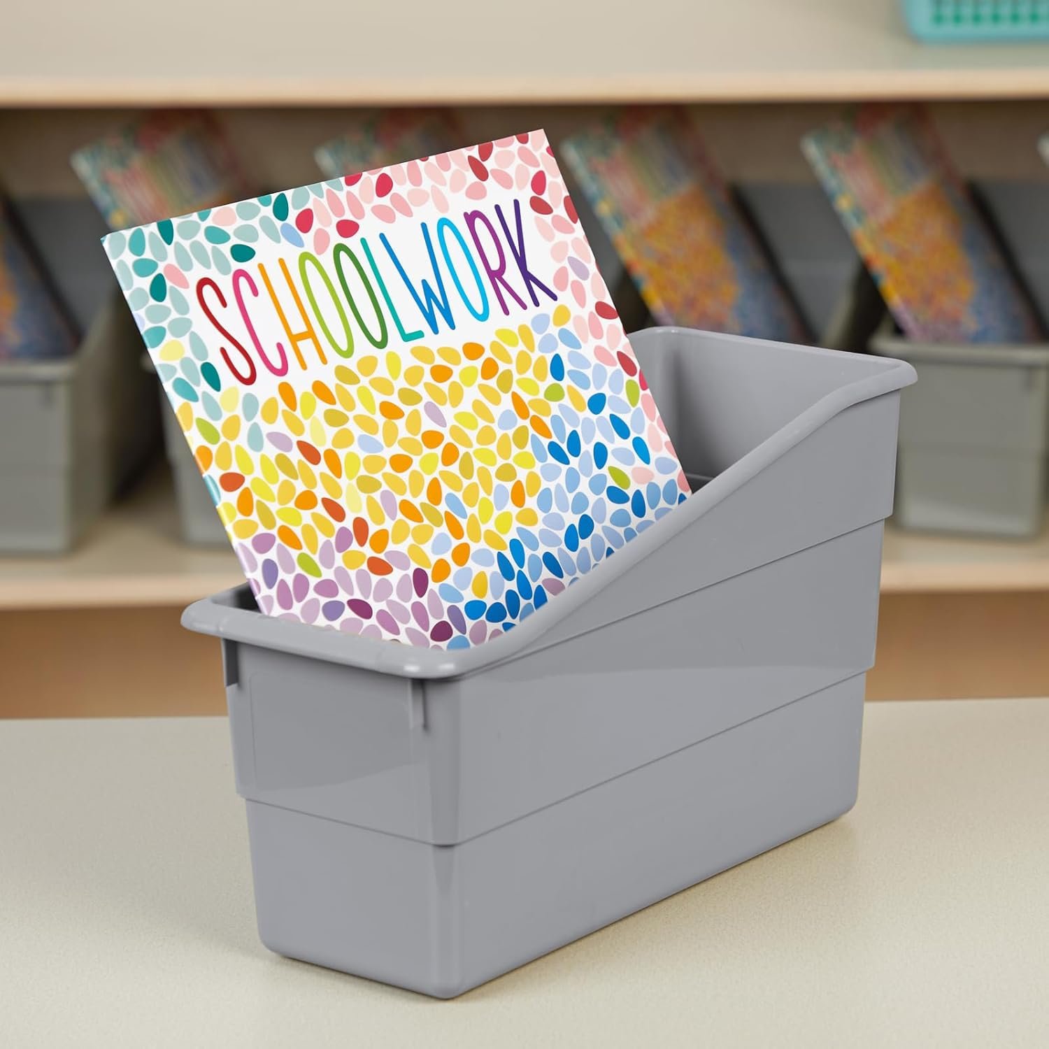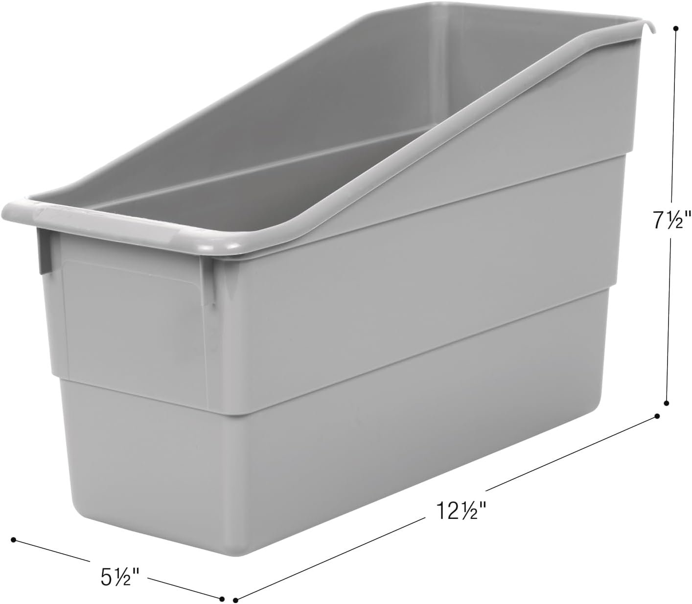 The students store a notebook, two binding books, and a hardcover book and 3-5 folders in this sturdy storage container. The students love the option of picking out their favorite color and this seems functional to assist with their organizational skills. I only wish the one end would be slightly higher so the container wouldn’t tip so easily. I need to buy another container to balance the size and weight of supplies to store all the students’ materials.