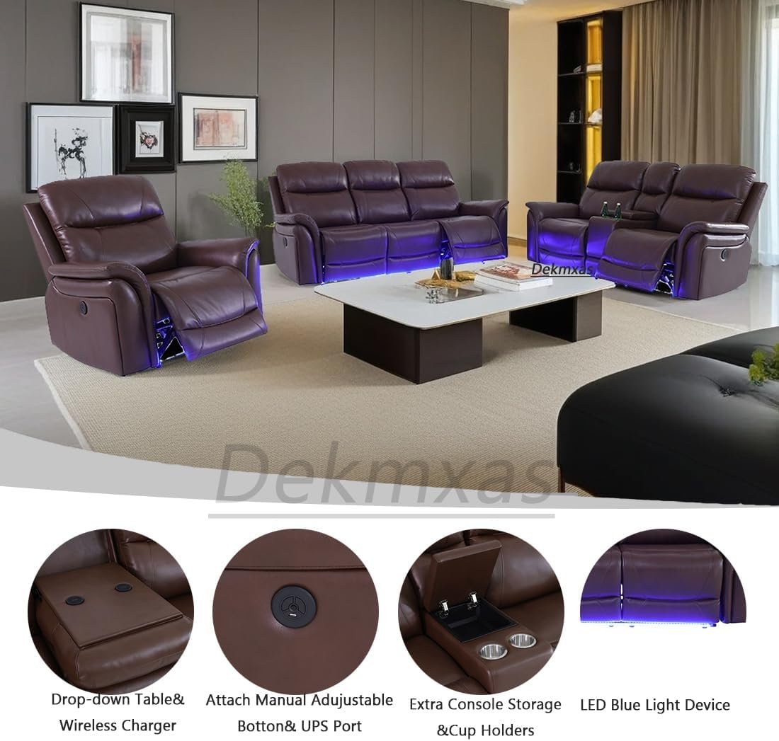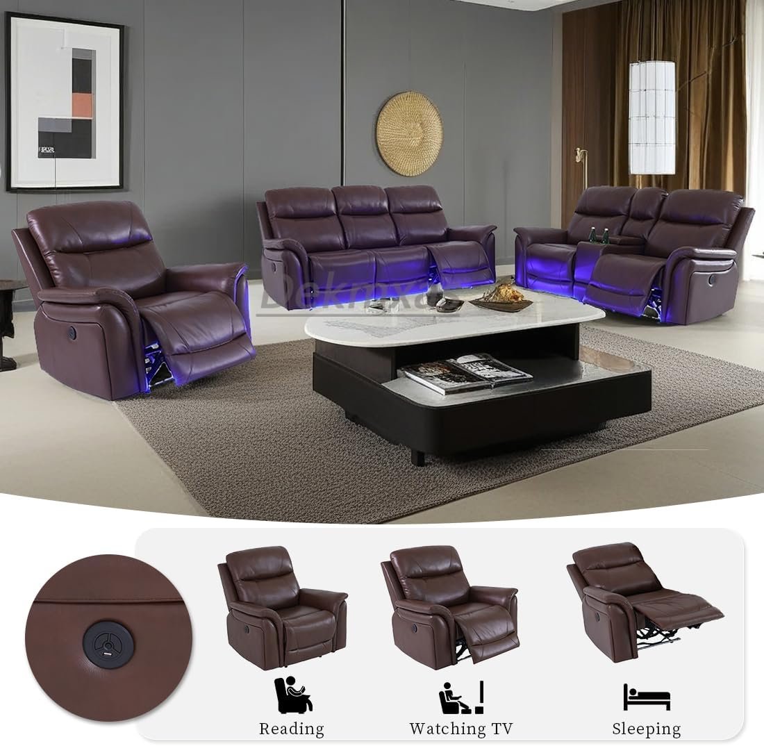 Recliner Couch Set 3PCS Breathing Leather Living Room Sofa Set Reclining Sofa Set with Storage Console/LED Blue Light for Apartment/Home/Office (Reddish Brown, 3PCS Set)