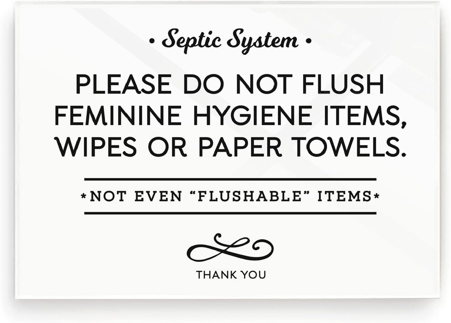 We have a rental home with a septic system. Some people have no idea that they have different rules than than a public sewer system. We placed a sign over the toilet paper holder in each bathroom to let guests know. They went on very easily, and they look great!