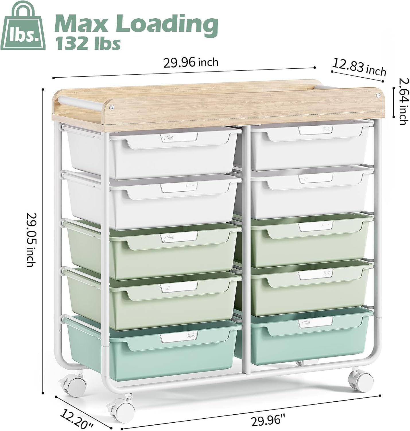 Rolling Storage Cart with 10 Large Drawers, Utility Cart with Wooden TableTop for Craft Organizers, Art Supply Storage, Home Office Organization, Cart with Wheels for Classroom, School, Green