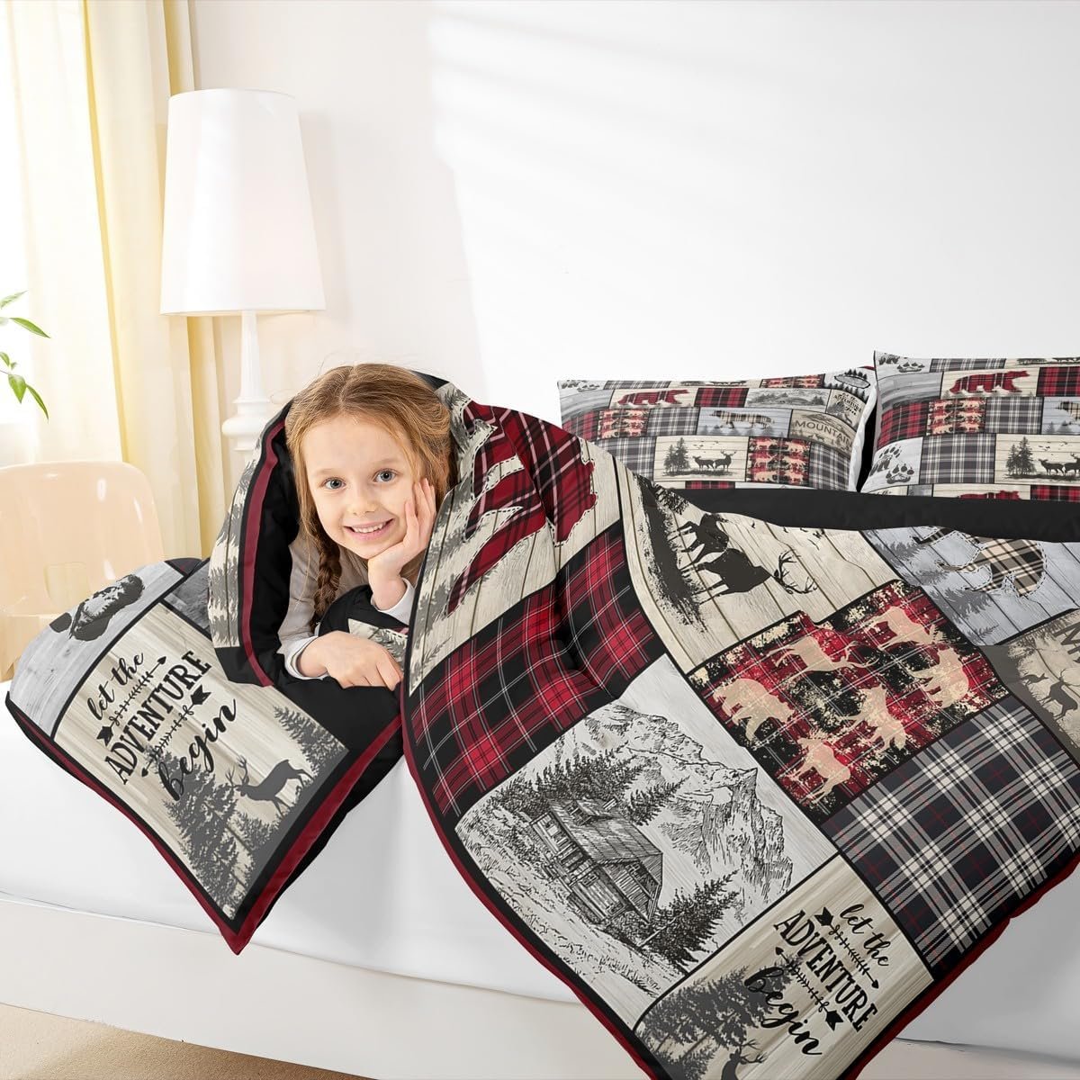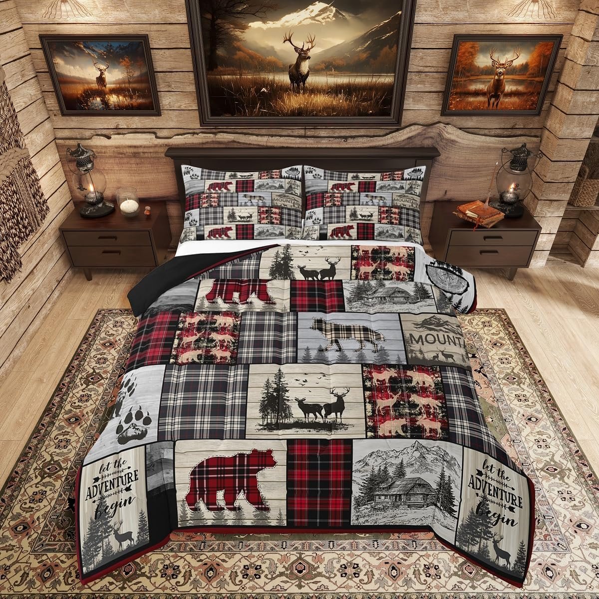 Rustic Cabin Comforter Set Queen Woodland Wolf Deer Bear Comforter For Kids Adults,Red Black Buffalo Plaid Bedding Set Wildlife Camping Lodge Mountain Quilt Bedding Southwestern Farmhouse Decor