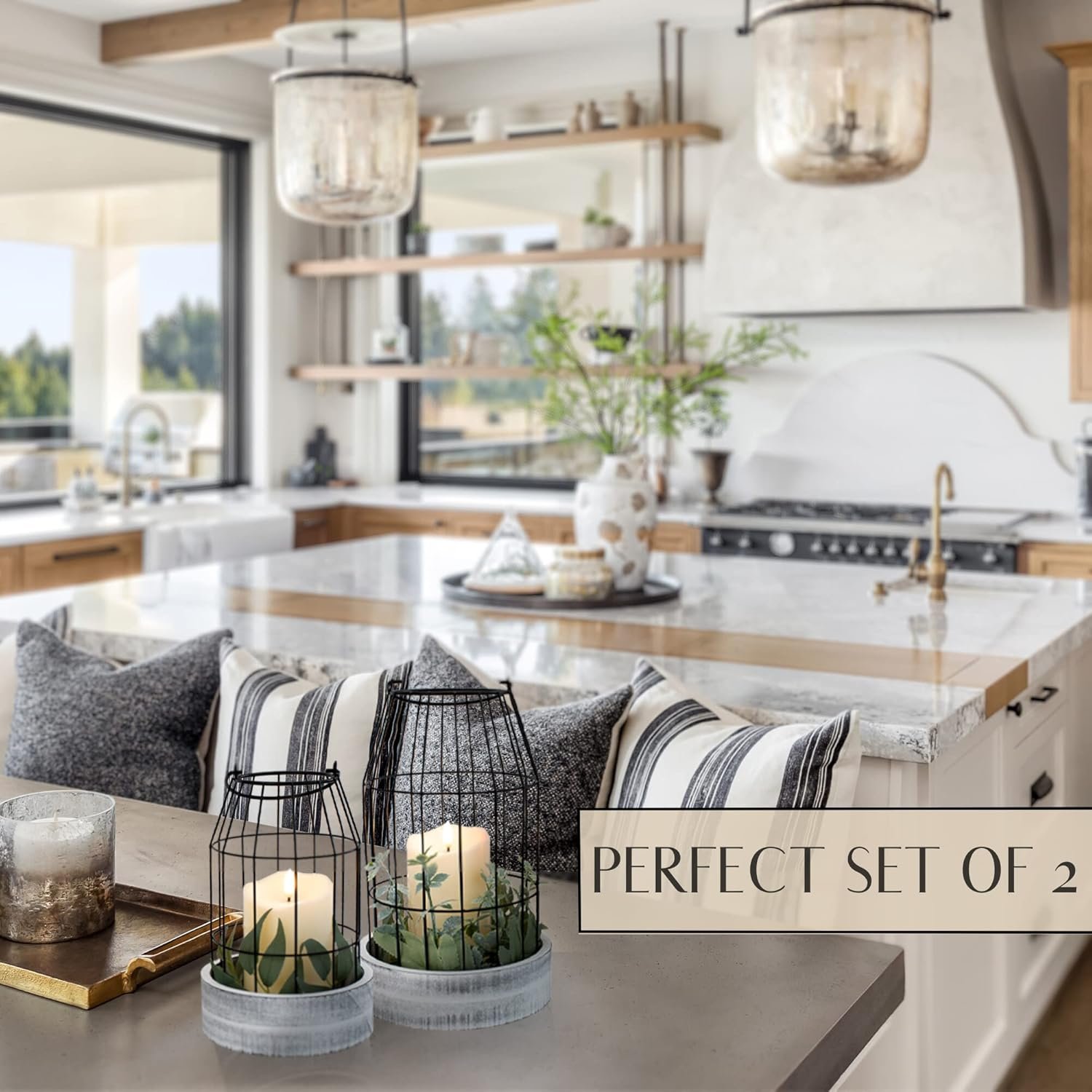 Rustic Farmhouse Lantern Decor Set of 2 – Stylish Decorative Lanterns for Your Living Room, Fireplace Mantle or Kitchen Dining Table – Modern Upscale Beauty for Your Entire Home