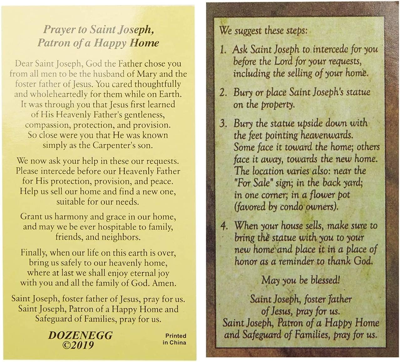 After all kinds of problems with selling our house (one person denied a bank loan to buy our house even though they had been pre approved, etc.) for a long period of time we decided to get the St. Joseph Statue to help. We prayed to St. Joseph after burying his statue near our for sale sign. We got an offer in 12 days and closed on the house exactly 50 days total (the buyer for our house was in the process of selling her condo, for cash) and was making a cash offer for our house. We went back to get the statue before the closing only to find the Statue gone. We are presuming that the man across the street took the statue after we saw him during one of our visits to just check on the house. He told us he was going to sell his house and I told him all about St. Joseph. Since he is the only person we had told about St. Joseph we presume he took it. We are supposed to bring the St. Joseph Statue to our new house but obviously can’t. We are kind of flabbergasted that someone would steal this statue. In any case, for those who are considering this please remember a few things. First it is up to YOU to make sure your house is clean, staged (remove the clutter, take the junk off the refrigerator door, etc. in other words make it decent. Also up to you to pick the right price. We did have to come down $2000 but that is minimal compared to us having to pay 2 mortgages , 2 electric bills, 2 home owners insurances, 2 flood insurance etc. We had found our new home when we thought the house was selling the “first” time and when it did not we were already committed to the new home. So we were in not such a great position over thesemonths. By the way we are not catholic. We did say the prayer to St. Joseph that came with the Statues and said it every single day. Some would call it superstition, some religious belief, some hokus pokus. What ever you call it I can only tell you that this entire situation surrounding St. Joseph worked for us. As far as the person who stole our Statue I am still upset so we decided to purchase another Statue to keep in our new home. Believe or disbelieve. If something works …it works. But keep in mind you have to do our part as well. You must get the house in decent shape possible and price it right. We believe.