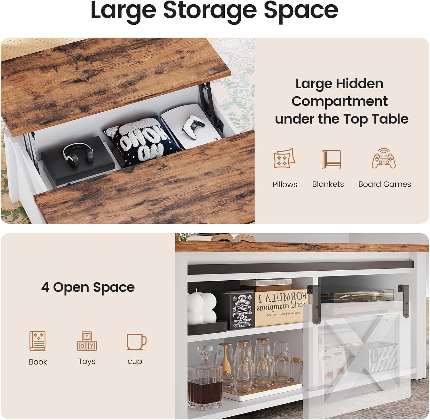 Had been looking for the perfect coffee table for my living room and came across this one. Personally I love it, especially because the table rises up and i can eat comfortably. When the table is lifted theres great storage space for blankets and/or pillows!! The side shelves with the barn door is perfect for storing books or movies. The color matching perfectly with my living room decor. Definitely recommend for small living rooms. Wasn’t too hard to put together.