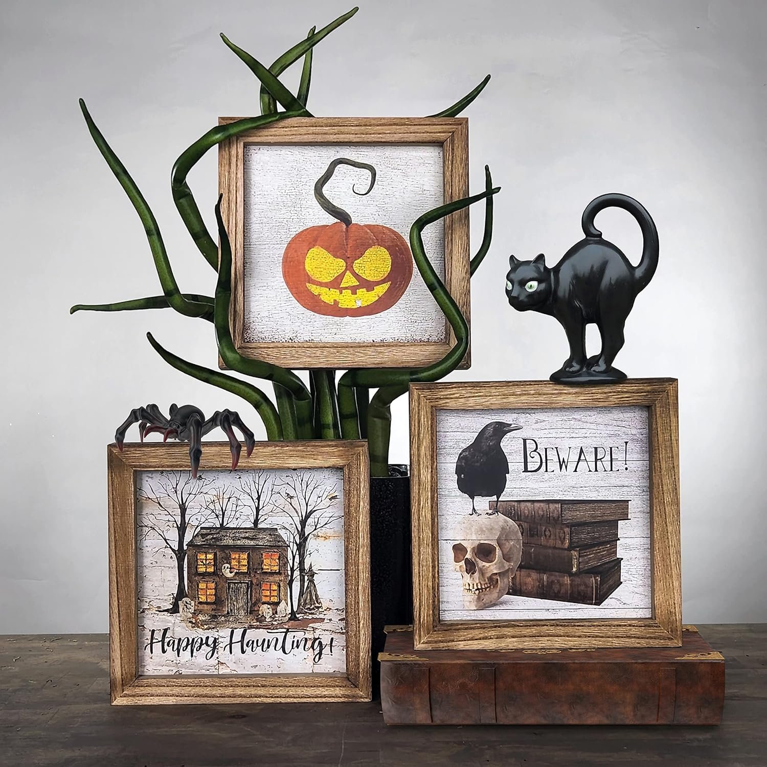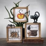 Honestly, this is one of my favorite pieces of home decor. I love that it has 3 thin cardboard inserts for all seasons and most holidays (even the not as popular ones). The artwork has a classic look to it. It is a very practical piece of home decor because it is interchangeable and can be used all year long. It looks great on a tiered tray or even an end table. They are double sided so that means that on the back of your Halloween image, there will be a different holiday or season. It is just something to be aware of, but not a dealbreaker.