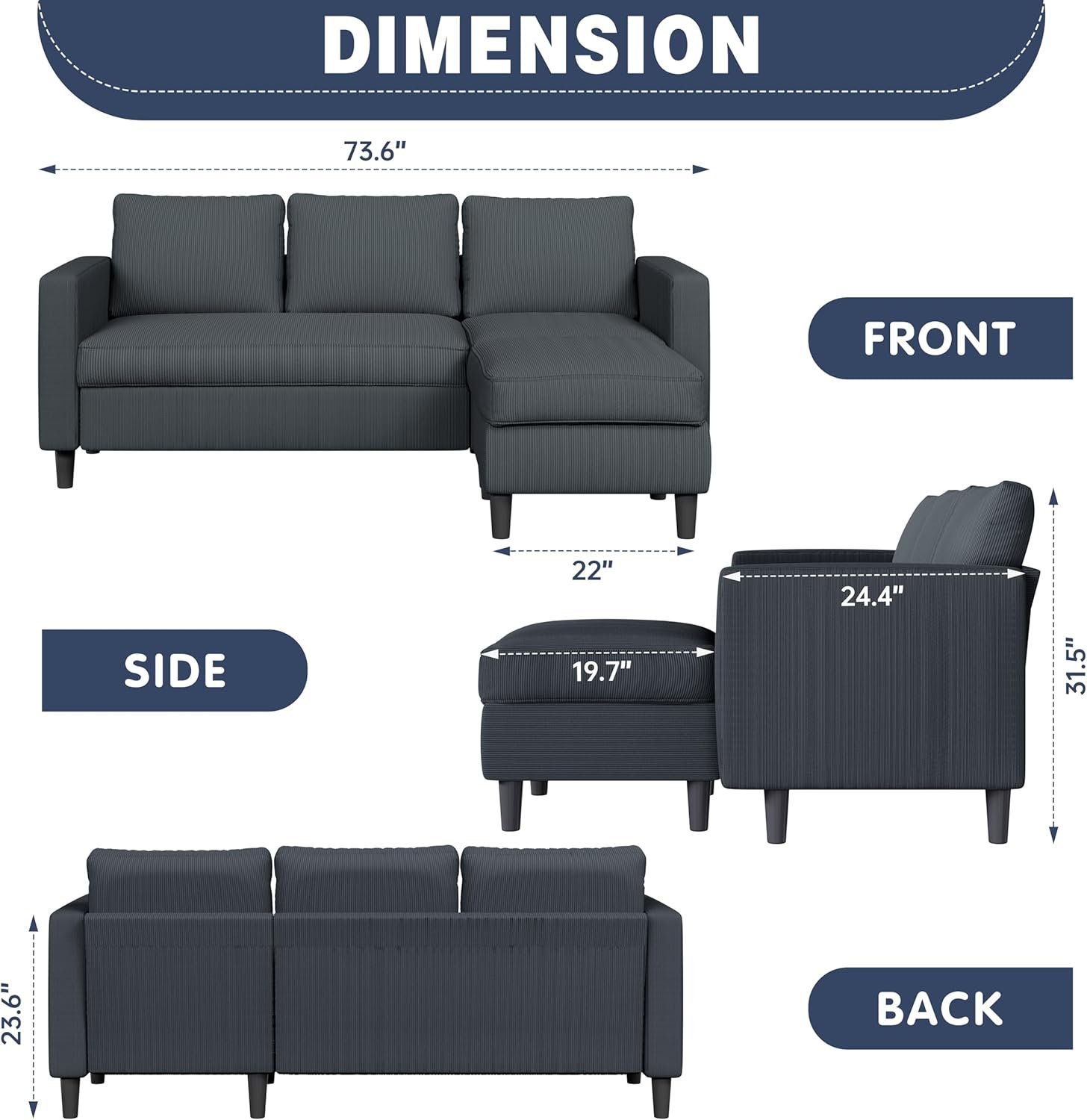 9 reviews for Shintenchi Small Sectional Couch Sofas, 3 Seat L Shape Sofa with Ottoman, Corduroy Upholstered Convertible Sofa Couches, Small Couch for Apartments, Living Room and Office
