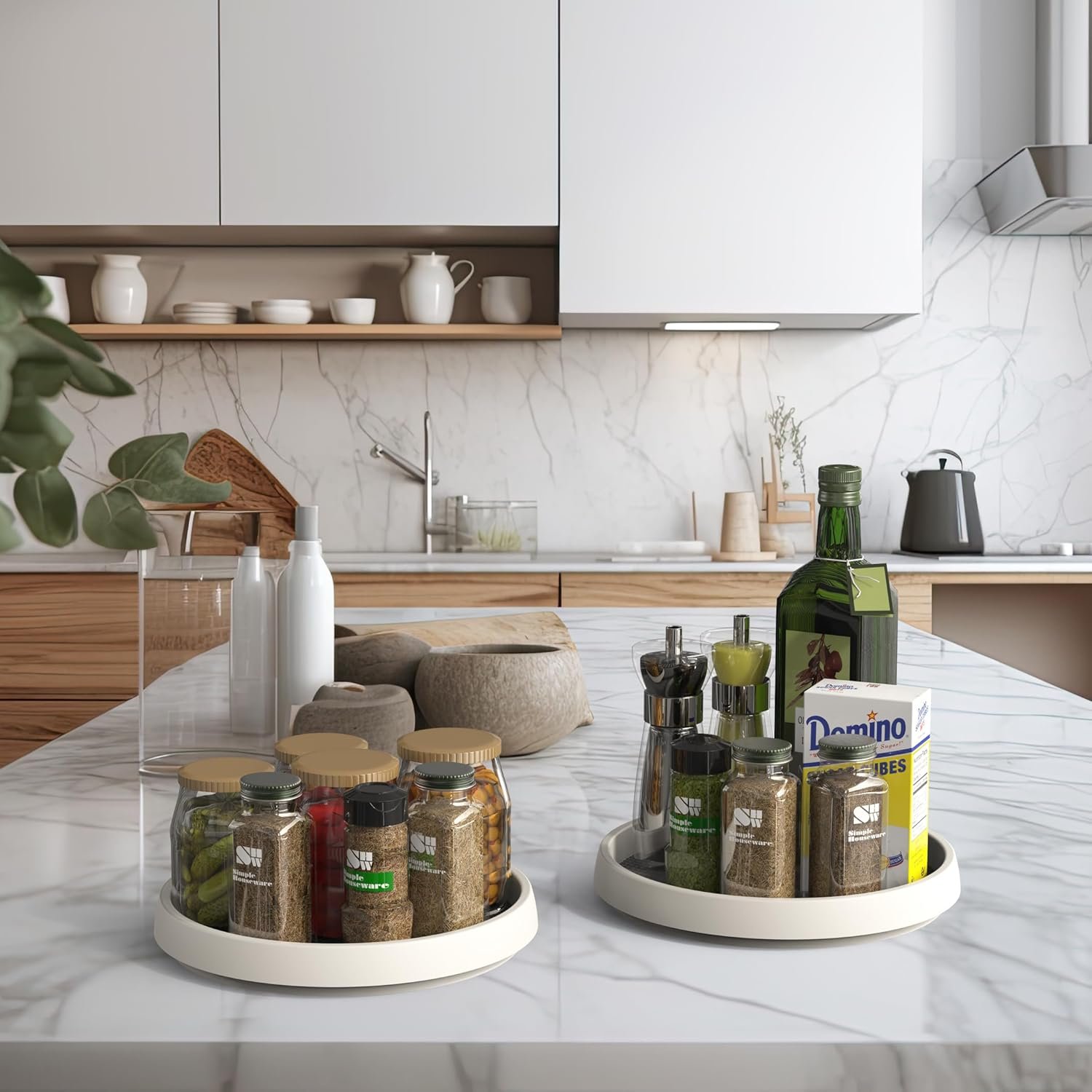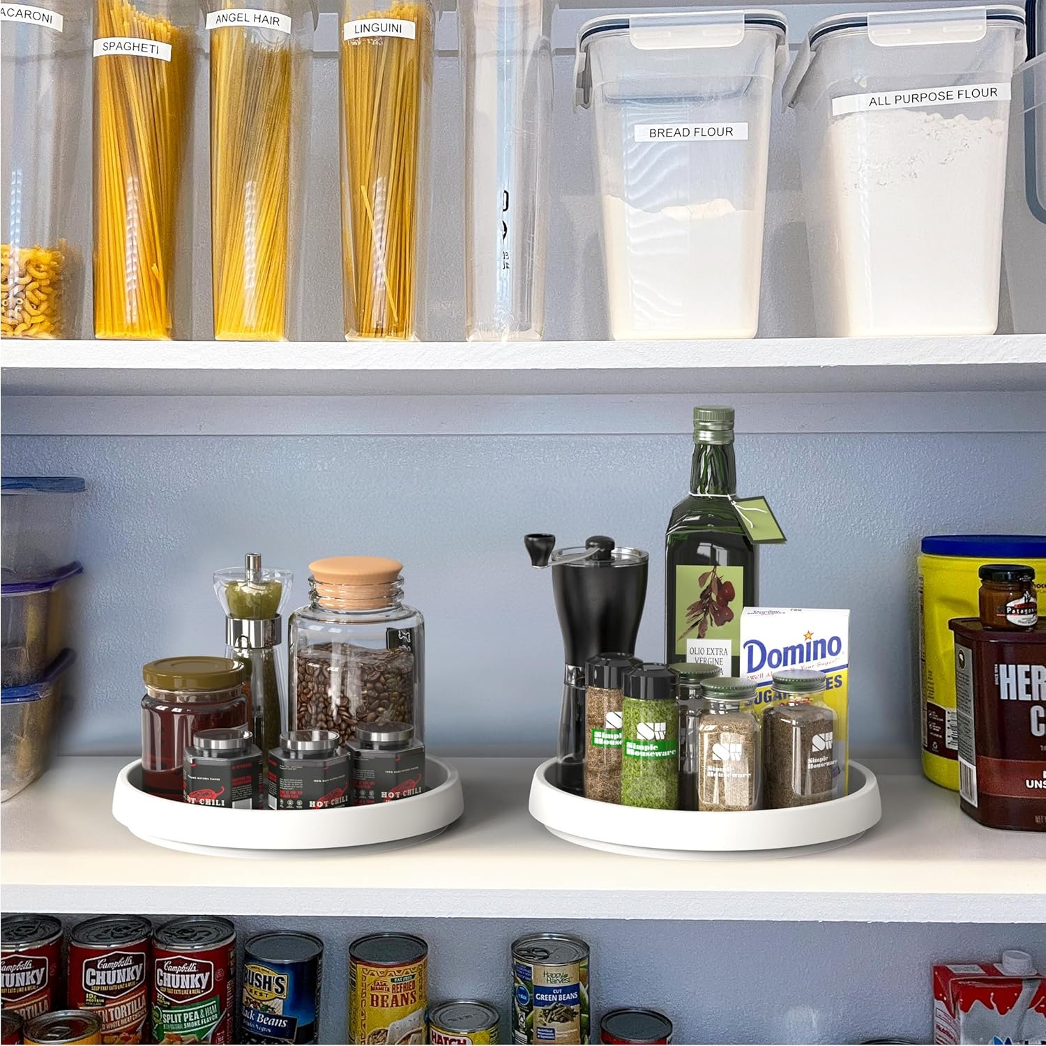 These do not fit in a standard depth upper kitchen cabinet. They’re about a half inch/inch too big which is such a weird size to go with.Otherwise, if you can find somewhere for them to fit, they spin nicely, are sturdy and have a nice non slip finish and a little lip to ensure things don’t fall off.
