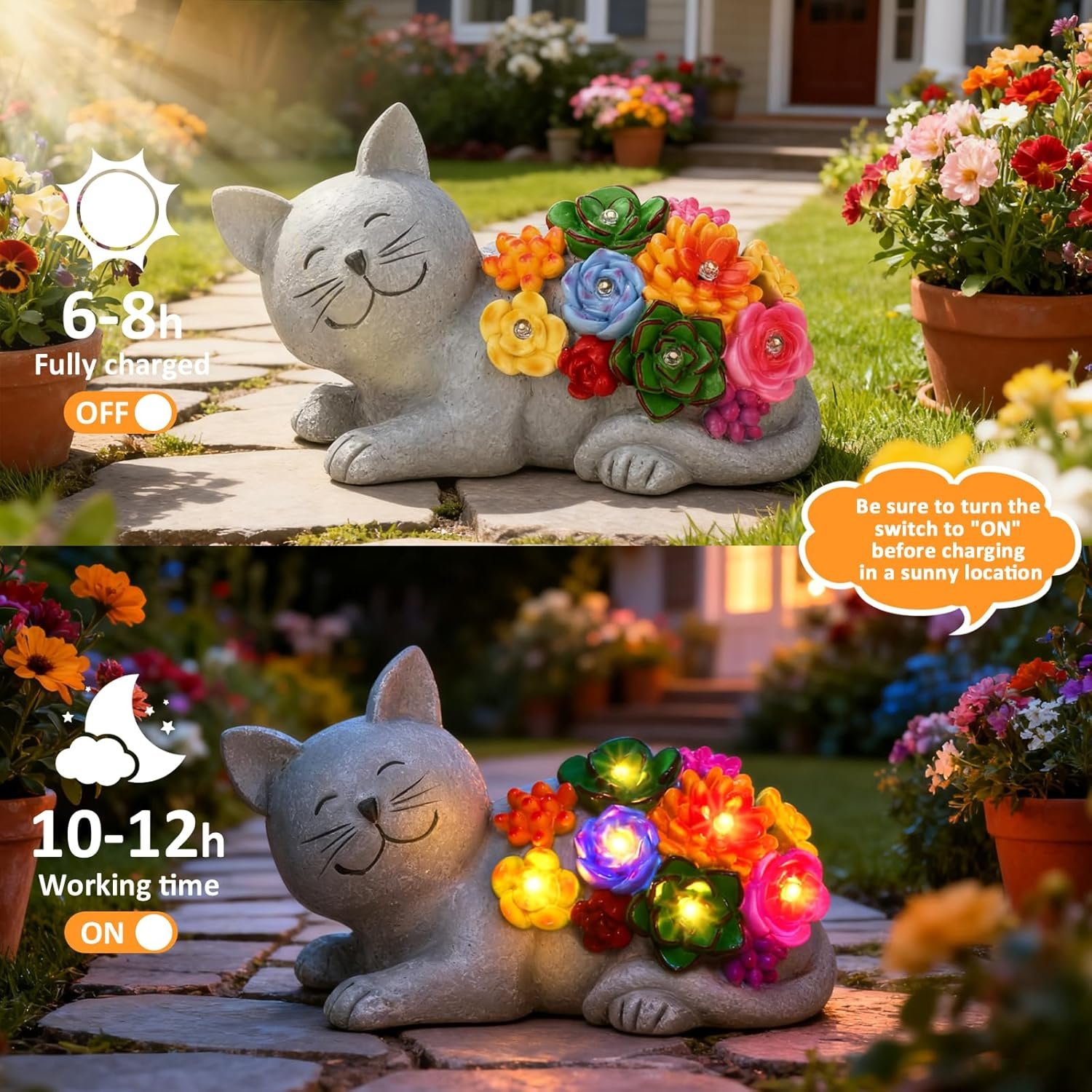 Solar Cat Garden Statues with Succulent and 6 LED Lights, Christmas Birthday Gifts for Women Mom Men, Outdoor Garden Decor for Cat Lover, Yard Decor Art Lawn Patio Balcony