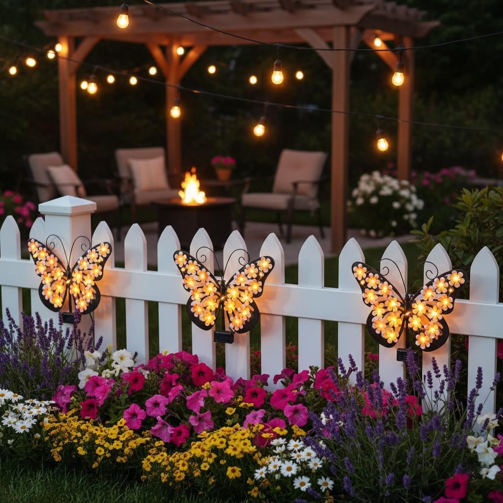 I really enjoy having lots of attractive lights in my backyard to enjoy during the summer and warmer fall months, before we have to pack everything up for yet another long cold Canadian(even worse, Albertan lol) winter. I also really happen to enjoy butterflies. I absolutely fell in love when I saw this Solar Butterfly fence decoration and knew I had to have it.Like most solar products, this was ready to go right out of the box. Its a sturdy black metal cutout of a butterfly with pretty pink flowers and a series of little fairy lights attached to the butterfly itself. The body is sturdy and solid, and I feel that it will hold up well for years to come. The little metal flowers are firmly set onto the body of the butterfly with no worries that they will come loose. The little solar panel blends well with the design of the light and is not obvious or intrusive. There is a handy little hook built into the back of the light to aid in hanging on any vertical surface.While I can’t think of any drawbacks to this product, I do have to admit that I wish it were available in colors other than black, and perhaps with some choices of sizes and different shapes of butterflies. It would be great to have a set of assorted solar butterflies from this manufacturer to start a collection. I’d snap them up in a short minute.Very pleased to be able to add this to my backyard decor to enjoy for the next few months.