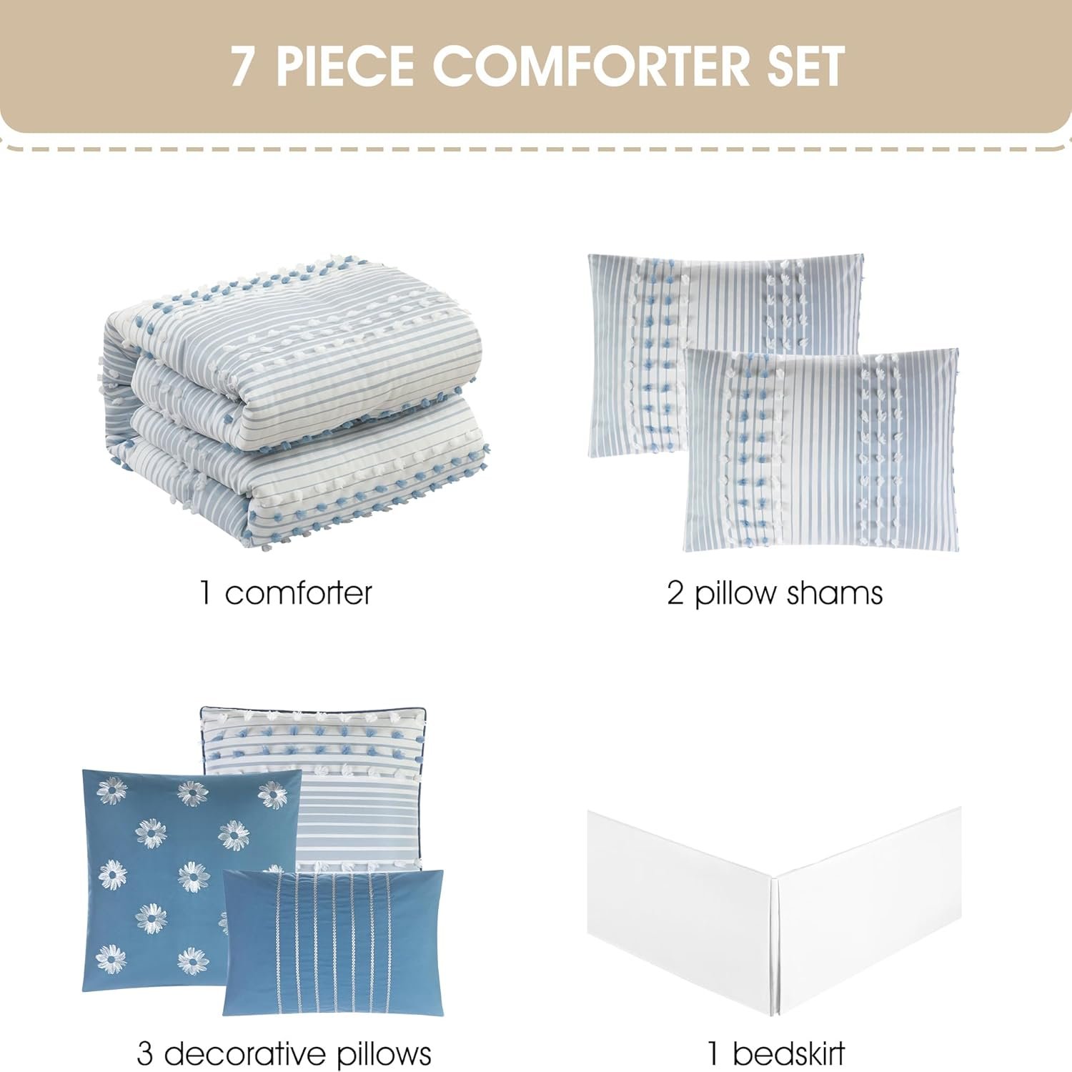 Stratford Park Azure Comforter Set California King Size, 7 Piece Clip & Jacquard Soft Bedding Set, All Season, Matching Pillows & Shams, Bedskirt