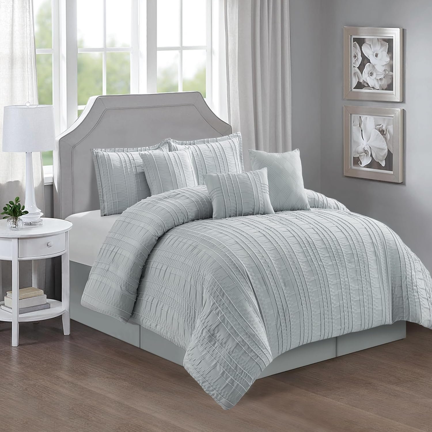1 review for Stratford Park Grey Clip Jacquard Comforter Set Queen Size, 7 Piece Striped Bedding Set, All Season Home Decor, Matching Pillow Shams, Bedskirt, Decorative Pillows