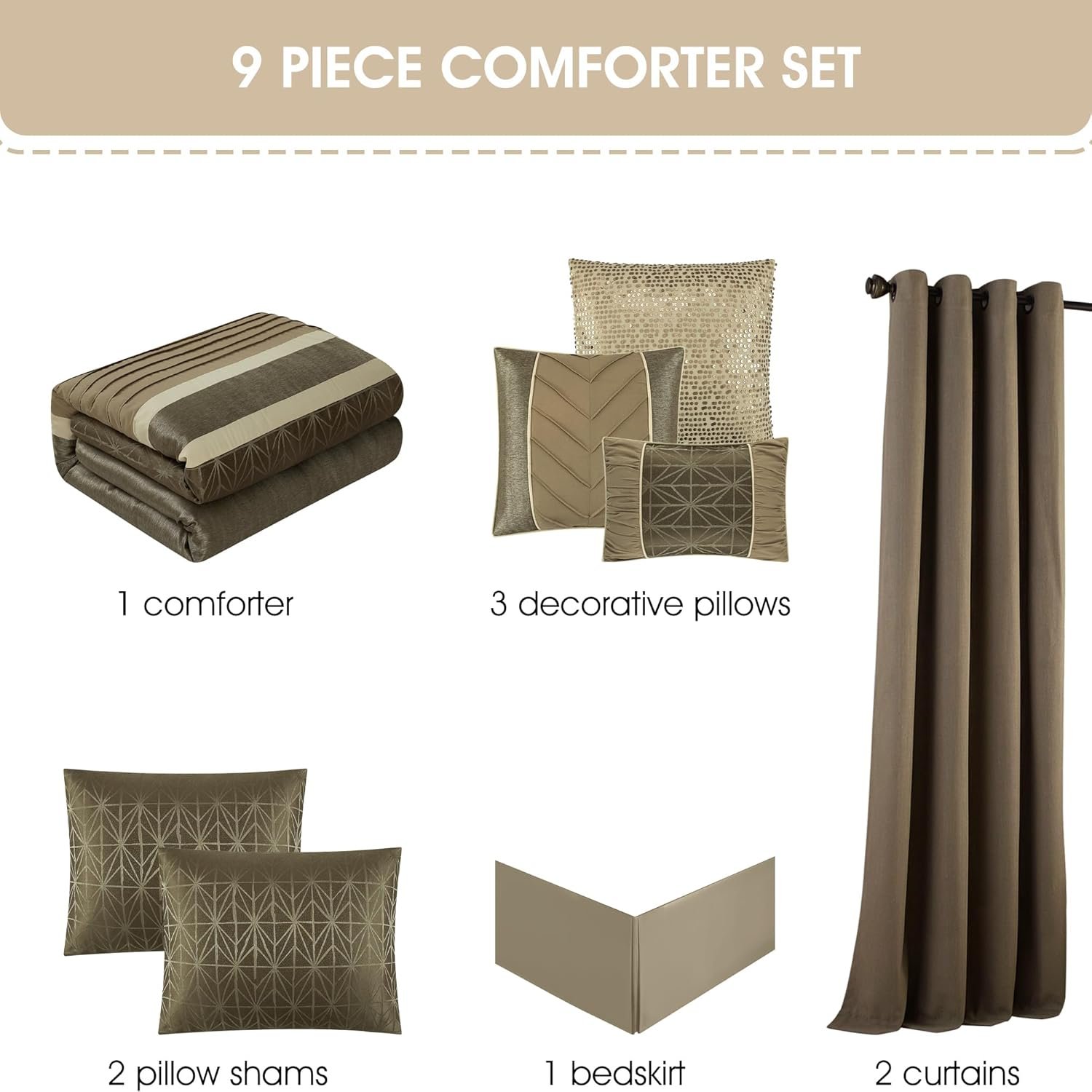 Stratford Park Taupe Comforter Set King Size, 9 Piece Geometric Bedding Set, Jacquard with Matching Solid Piecework, Bedskirt, Pillows & Shams, Curtains