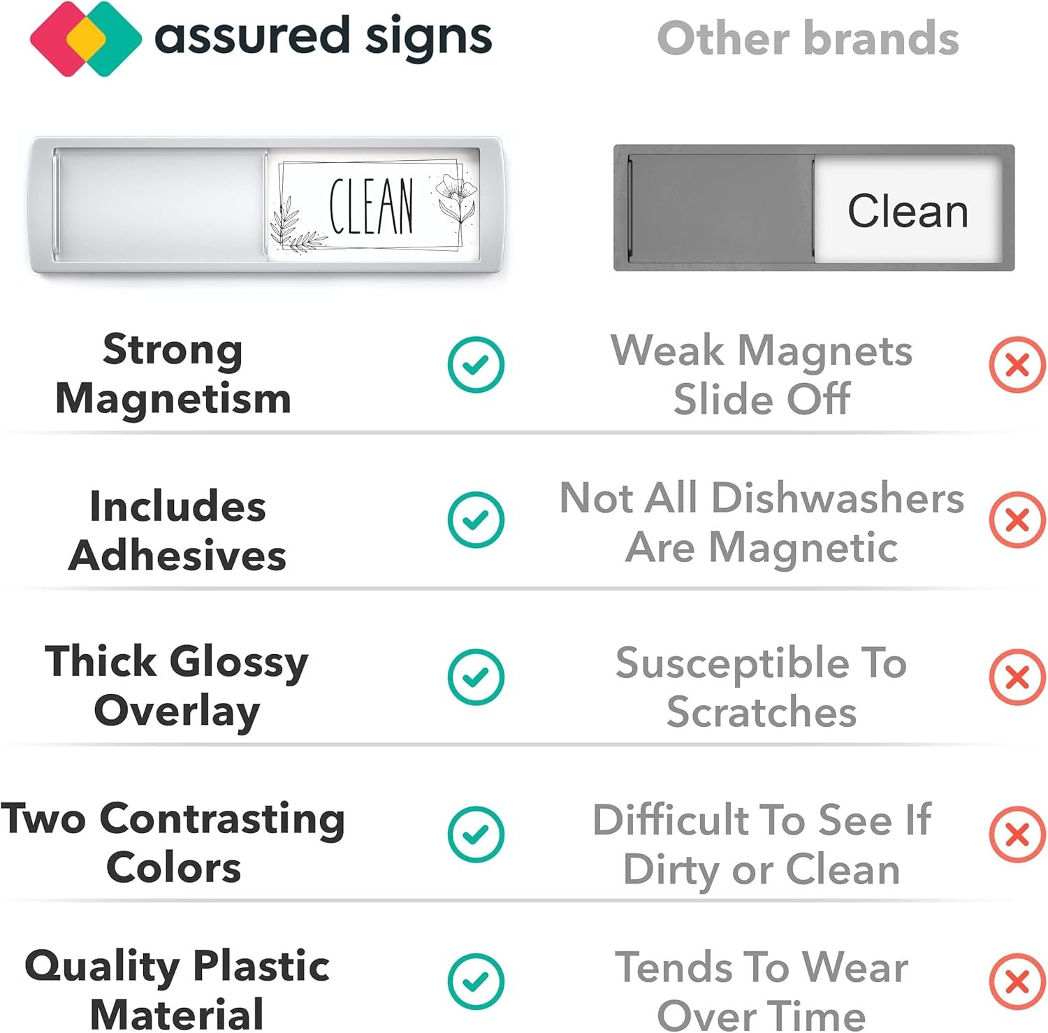 No more confusion for my husband about the dishes in the dishwasher. This sign replaces a magnet that I would flip from clean to dirty depending on the state of the dishes. Loved the magnet but it required constant cleaning of fingerprints. This sign simply slides from clean to dirty and back. Looks great on my dishwasher and blends well with my kitchen. Prompt delivery and quality product at a good price.