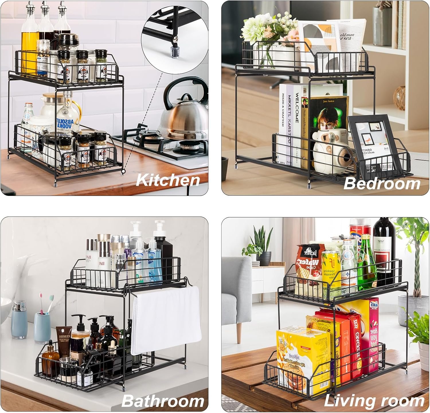 The 2-Tier Pull Out Cabinet Organizer Sliding Storage has revolutionized the way I utilize the space under my sink. This product is an absolute game-changer for anyone seeking efficient and effective organization in their kitchen or bathroom cabinets. It maximizes storage capacity while ensuring easy access to all items, making it a must-have for every household.First and foremost, the design of this organizer is outstanding. The two-tiered sliding shelves allow for effortless access to items stored in the back, eliminating the need to rummage through cluttered spaces. The smooth gliding mechanism ensures a seamless and noiseless operation, making retrieval of items a breeze. I no longer have to reach blindly or remove everything from the cabinet to find what I need.The sturdy construction of the pull-out shelves ensures durability and stability. The high-quality materials used in its manufacture can withstand the weight of various items, from cleaning supplies and toiletries to pots, pans, and kitchen gadgets. I was pleasantly surprised by the weight-bearing capacity of this organizer, which allows me to store even bulky items without any concerns.One of the standout features of this product is its adjustability. The sliding shelves can be easily adjusted to accommodate different heights and sizes of items. This flexibility is incredibly convenient, as it allows me to customize the storage space according to my specific needs. Whether I need to store taller bottles or shorter cleaning tools, this organizer adapts effortlessly.Installation was a breeze as well. The included instructions were clear and concise, and all the necessary hardware was provided. With just a few simple steps, I had the organizer installed and ready to use in no time. The compact design of this pull-out cabinet organizer ensures it fits perfectly in most standard cabinets, making it an excellent space-saving solution.If you’re looking to transform your cluttered cabinets into efficient and organized spaces, I highly recommend investing in this pull-out cabinet organizer. It has truly transformed my daily routine and exceeded my expectations in terms of functionality and convenience.