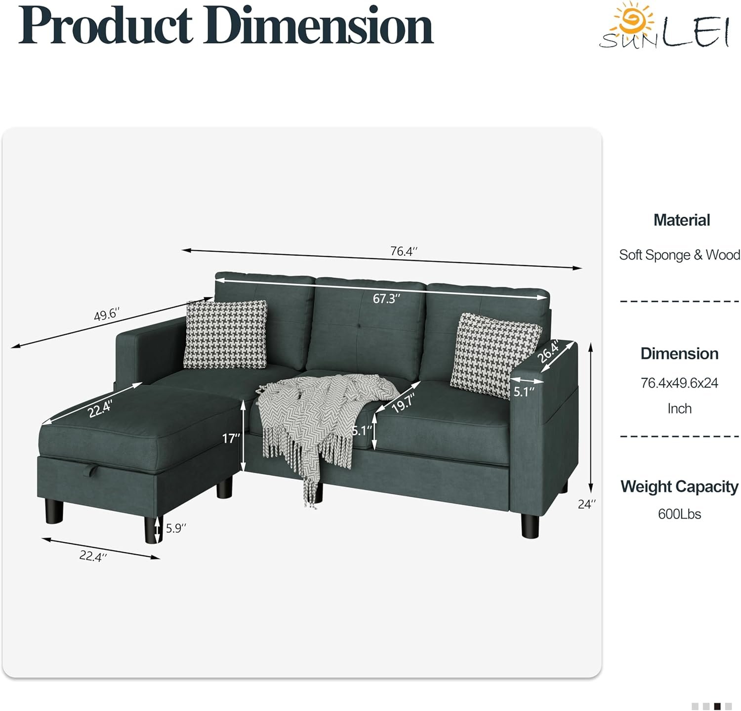 8 reviews for SUNLEI Convertible Sectional Couches for Living Room, L Shaped Couch with Movable Ottoman Storage, 3 Seat Small Couches for Living Room in Apartment, Linen Fabric, Dark Grey