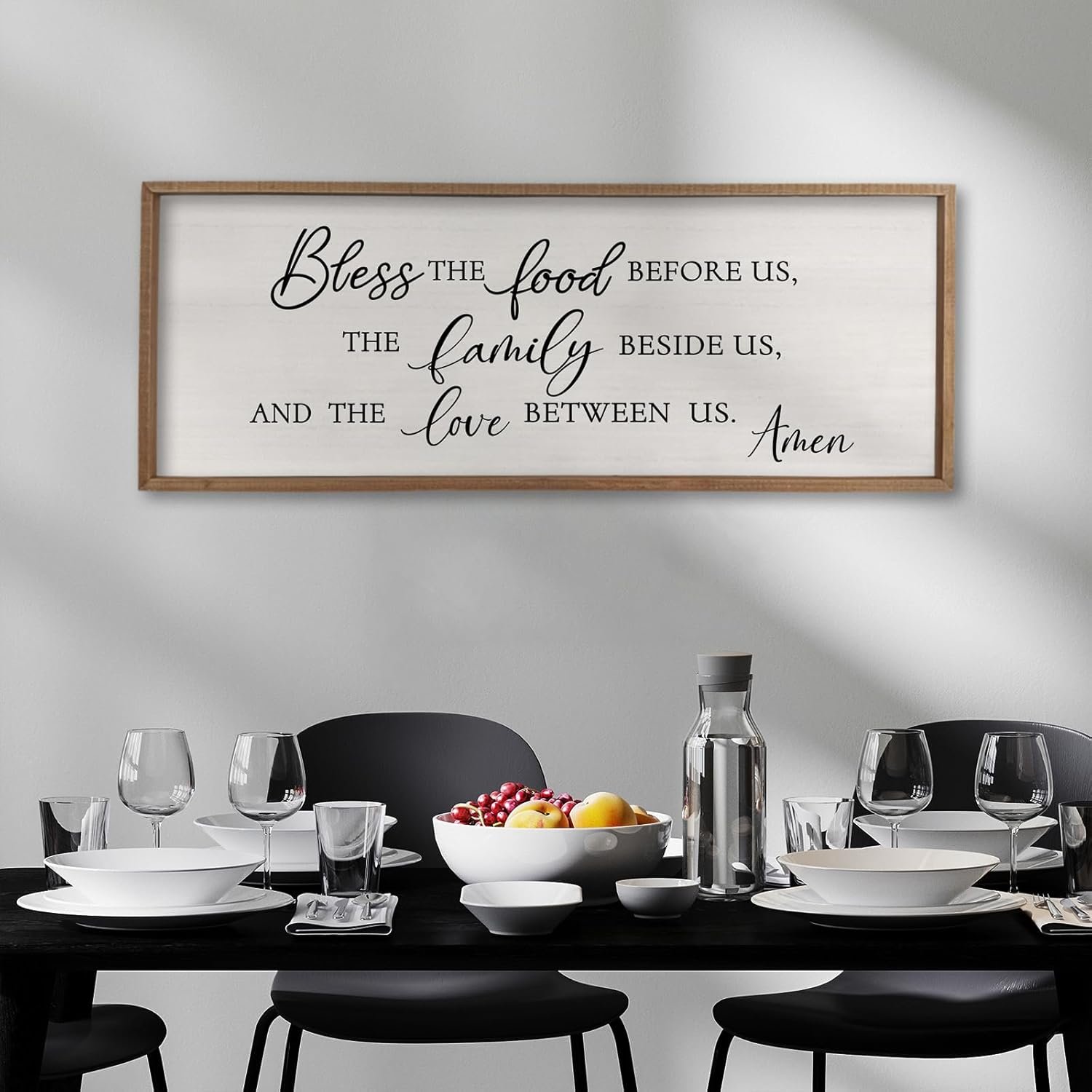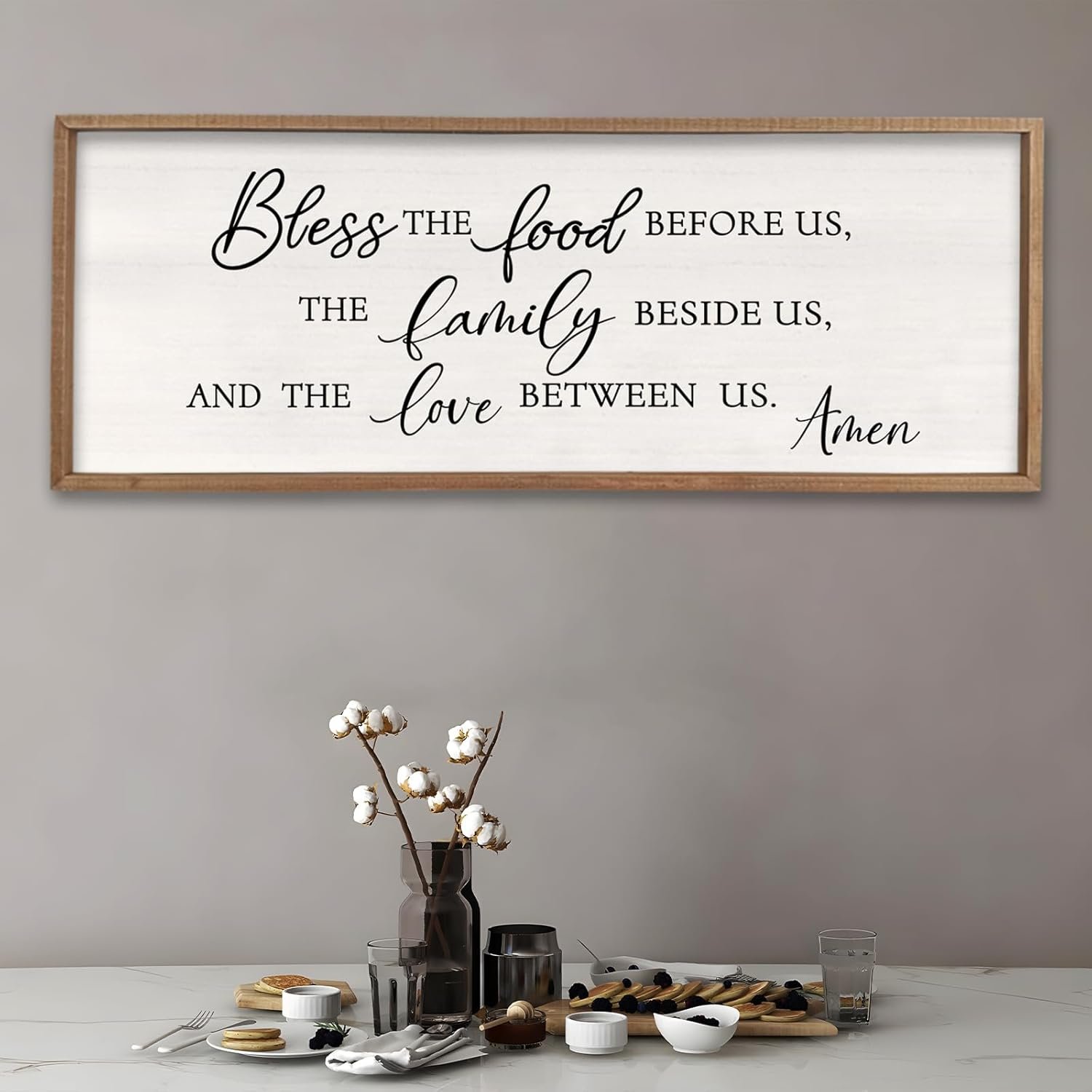 Surfapans Bless the Food Before Us Wall Decor, 40″X15″ Farmhouse Dining Room Family Kitchen Sign, Christian Bible Verse Scripture Vintage Home Framed Wood Wall Art(Wood White)