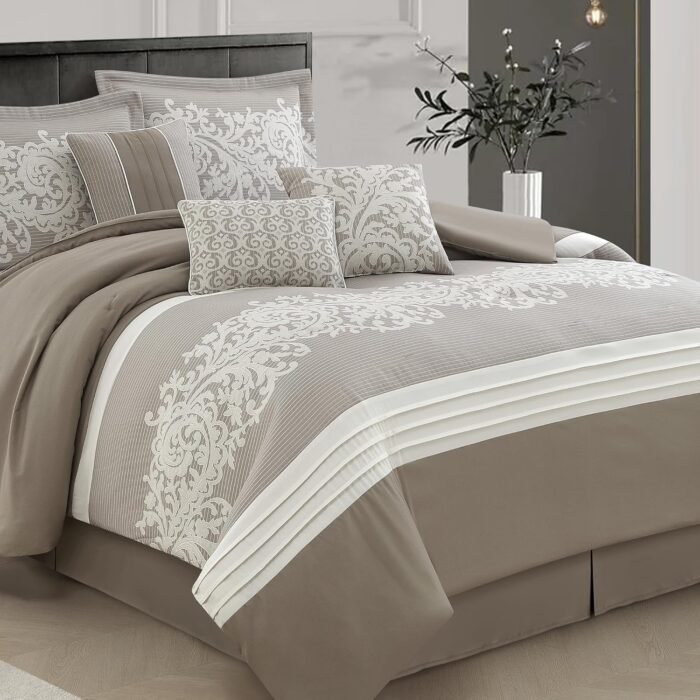 8 reviews for Taupe Comforter Set, King, Damask Jacquard with Matching Solid Piece Work, 7 Piece Soft Bedding Set for All Season, Bed Skirt, Pillow Shams and Decorative Pillows