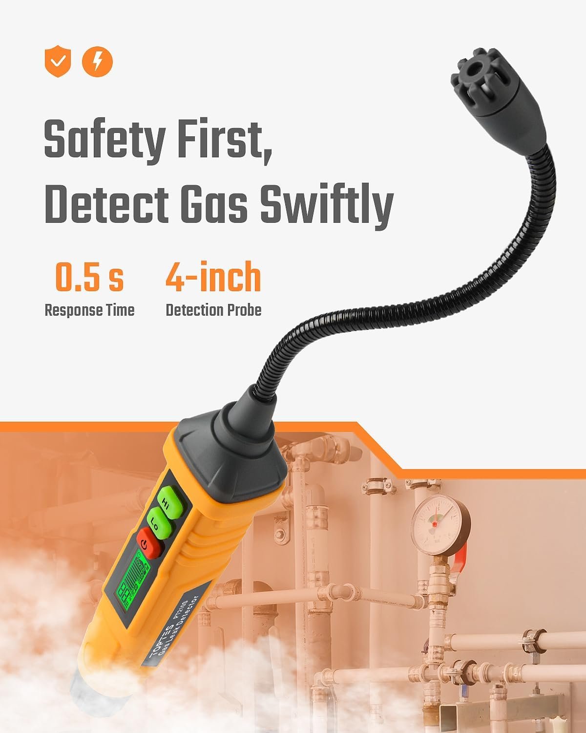 TopTes PT210S Gas Leak Detector, Natural Gas Detector with 4-inch Probe, Propane Leak Detector Locating Combustible Gases Like Natural Gas, Methane for Home, Measures%LEL (Incl. Batteries) – Orange
