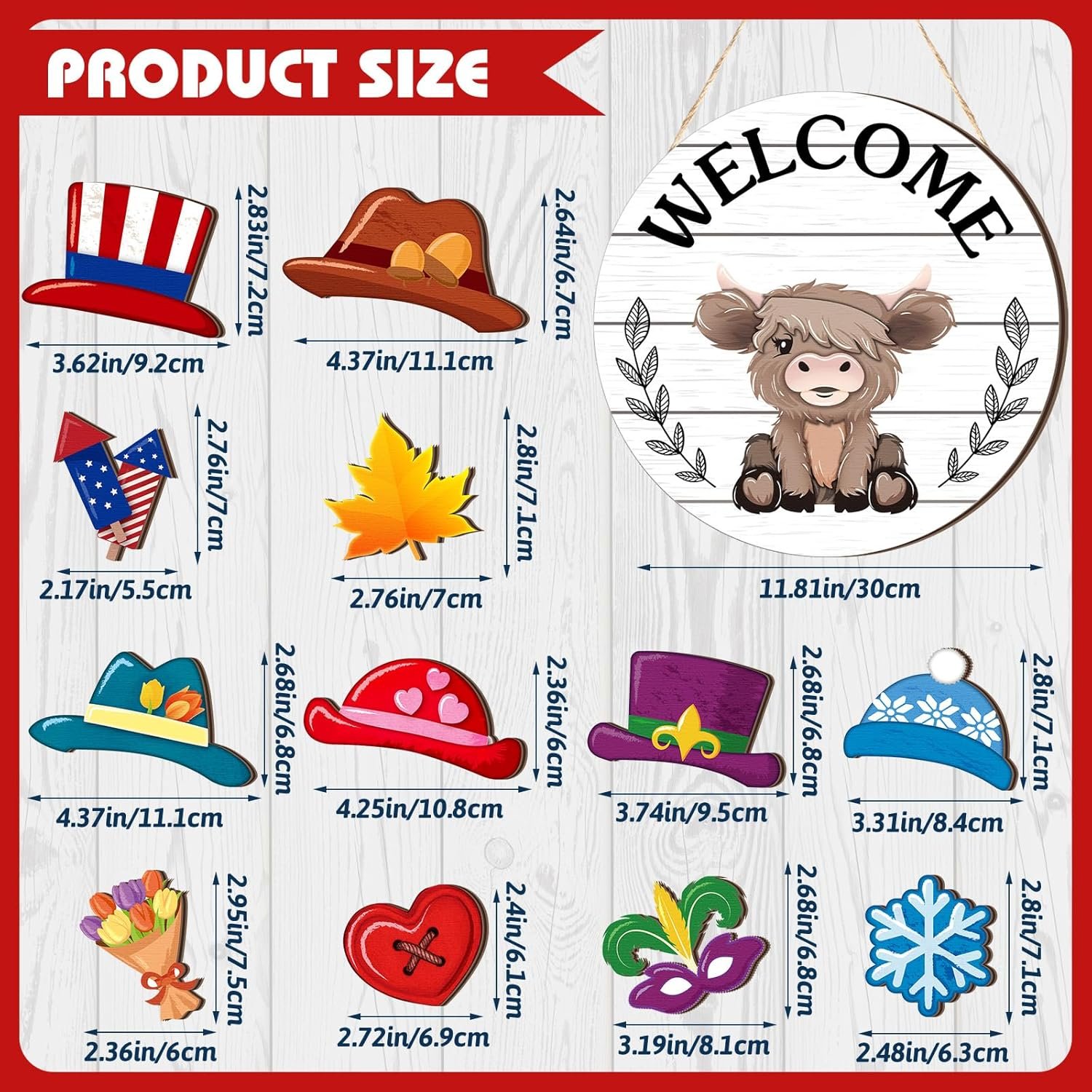 Vicenpal 35 Pcs Interchangeable Highlands Cow Welcome Sign Hanging Seasonal Cow Head Wooden Front Door Decor with 17 Interchangeable Hat 17 Magnet Swappable Pieces for Farmhouse Holiday (White)