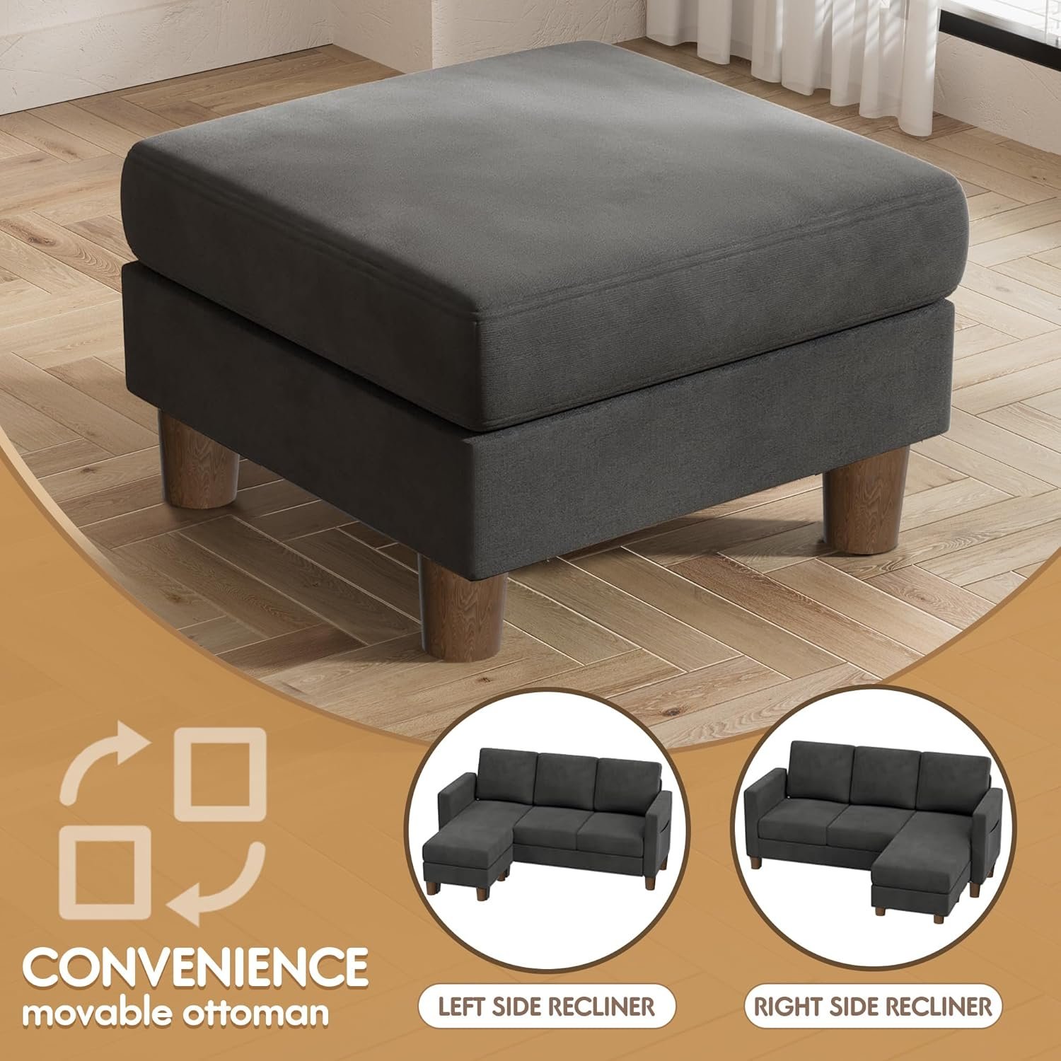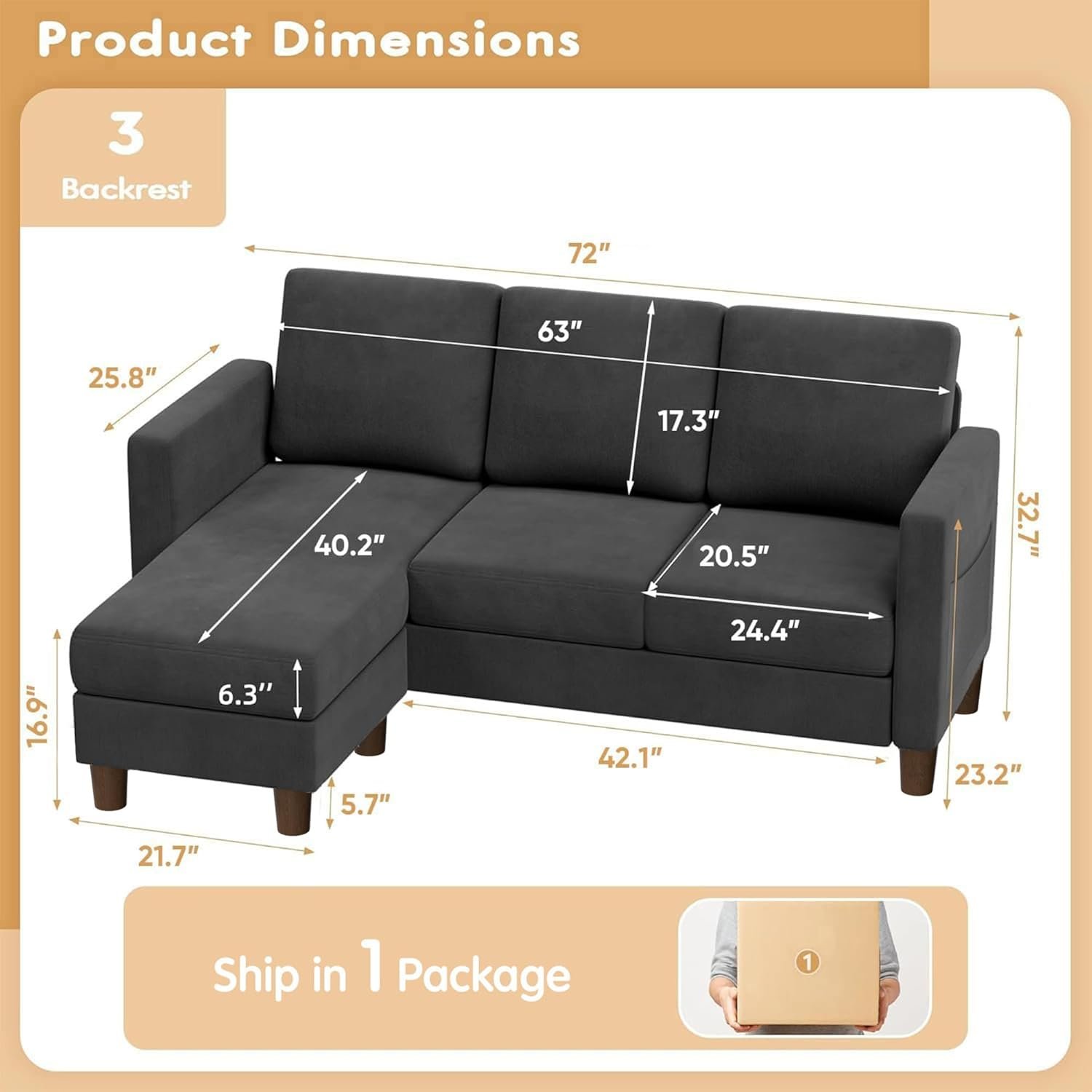 1. Description states this couch can be configured into an L-shape or with a free standing ottoman that can be moved around the room. As shown in my picture, there is absolutely no configuration of the base cushions that allow for anything other than an L-shape.2. Description states to give the foam 48 hrs for full expansion and photos and video in the description show an almost over stuffed look. I allowed the 48 hrs and the back cushions only expanded to 2 inches. I even took the foam out of the cover as to not constrict the expansion.3. Extremely uncomfortable! This is not usable at all! This is not a “long term use” couch. It is not even a short term use couch or for guests. I would not subject anyone this. My husband aslo found it uncomfortable. There is essentially no “cushion” for your back at all.4. The legs are plastic with no felt or non slip pads. A slight bump of the couch had it sliding on the floor so it moved while simply attempting to sit on it.5. It arrives in 2 boxes as stated in the description. Once the first box is delivered Amazon shows your oder completely delivered and not box 1 of 2 as it should. There is no way track the second box without contacting seller.6. This couch did not last for 5 minutes assembled before we started taking it a part to re-box it and start the return process.IT IS NOT WORTH THE MONEY.THIS IS UNUSABLE.