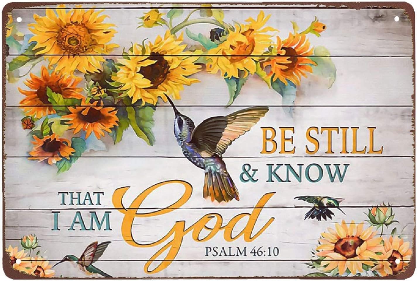 Vintage Be Still & Know That I Am God Metal Tin Sign Inspirational Scripture Poster Sunflower Bible Verse Wall Art Sign Hummingbirds Biblical Decor For Home Garden Kitchen 12×8 Inch