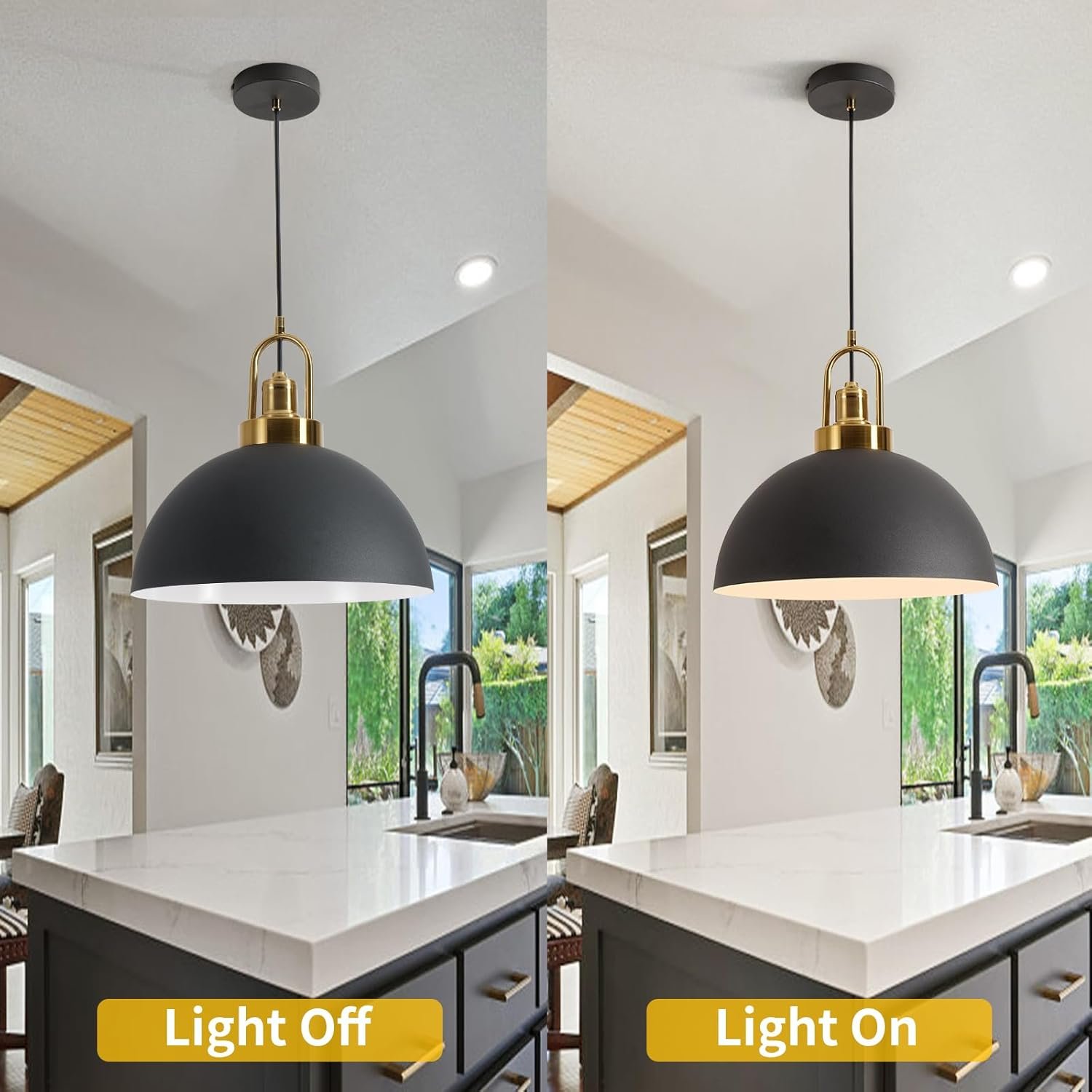 This is the second set of these lights I purchased. They are good looking lights and complement my island. However, the first set I bought has a goldish hue inside the shade whereas the second set had more of a flat white interior. Externally they have the same trim.
