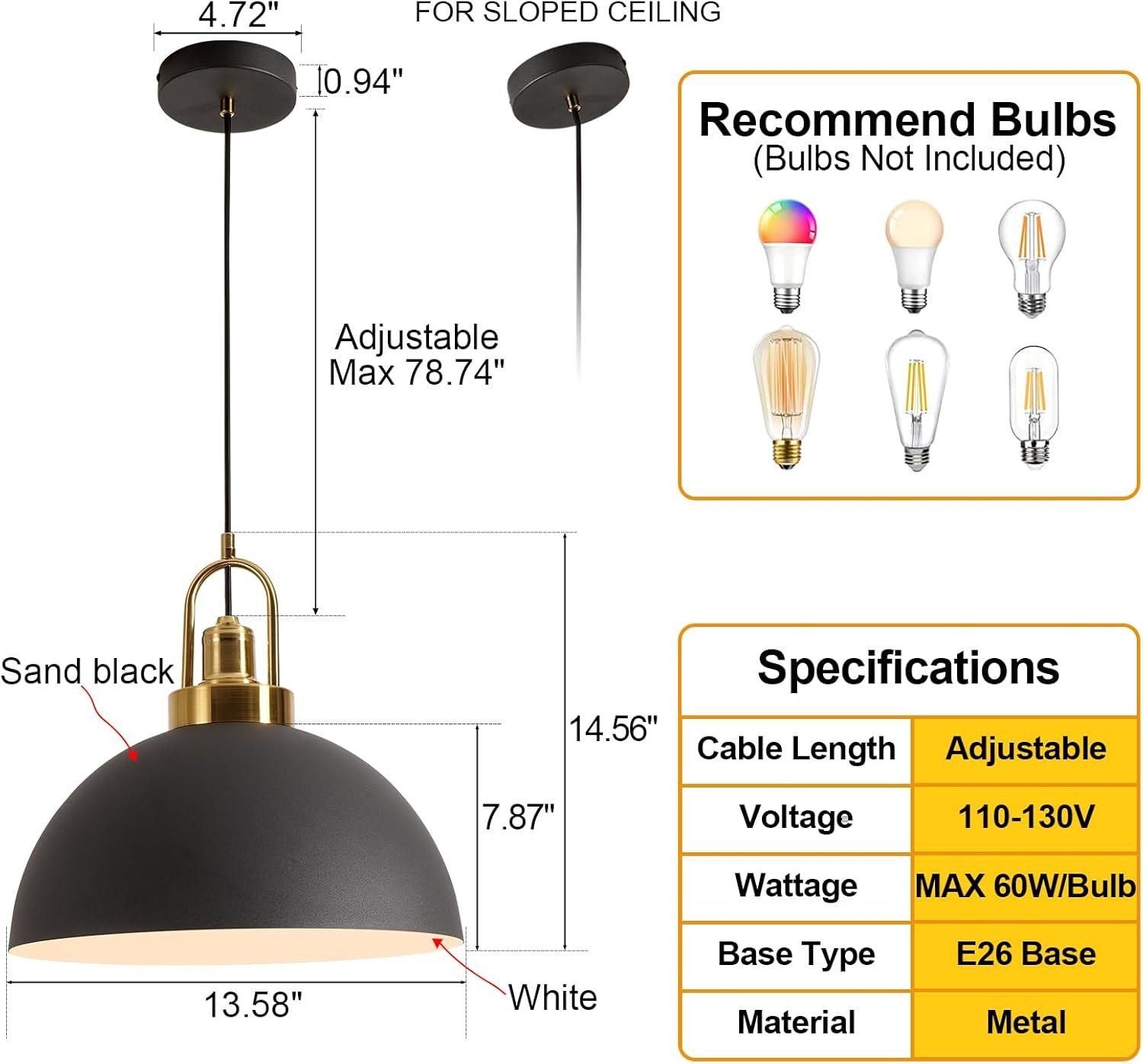 Vintage Industrial Black and White Iron Pendant Light,Hallway – Diameter 13.58 “- Wire Length 78.74”,Copper Socket Pendant Light, Suitable for Kitchen Islands,