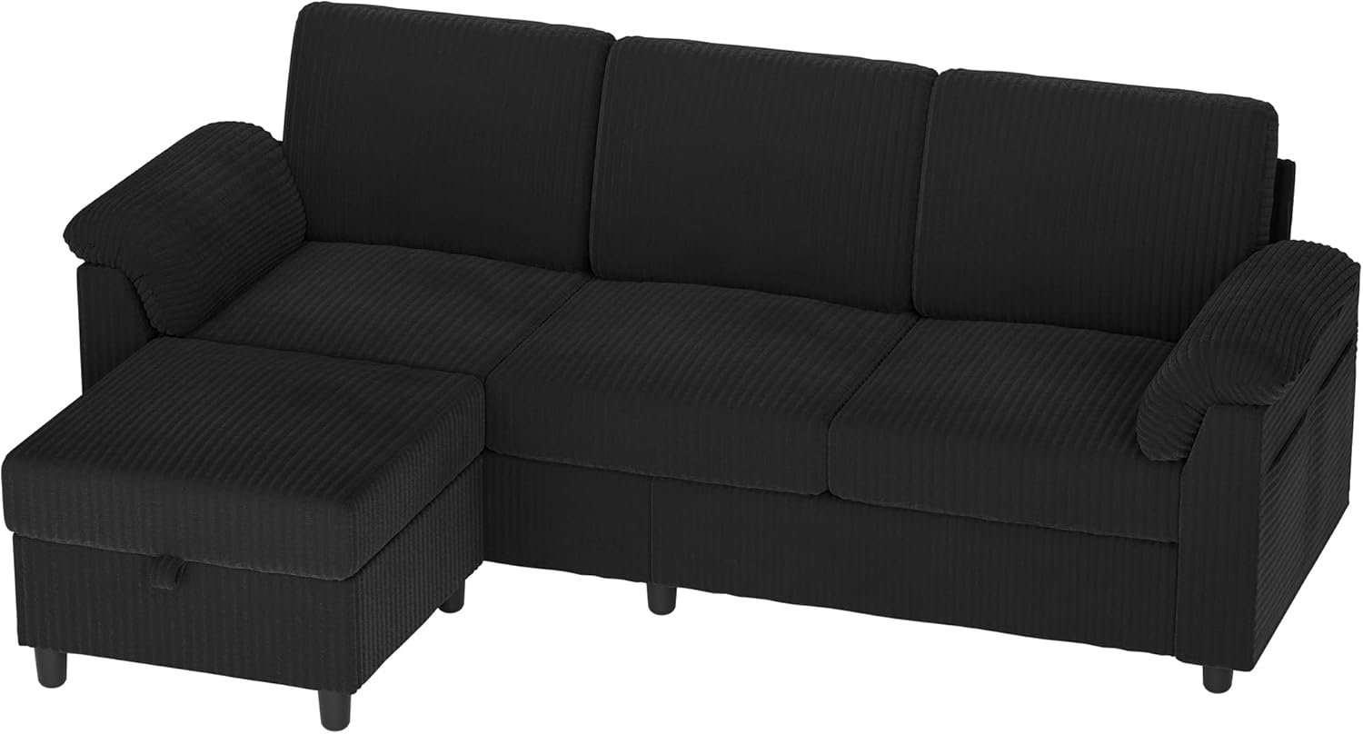 Vongrasig 79″ Convertible Sectional Couch Sofa with Storage Ottoman, 3 Seat L Shaped Couch with Side Storage Pockage, Linen Fabric Small Couches for Living Room, Apartment and Small Space, Black