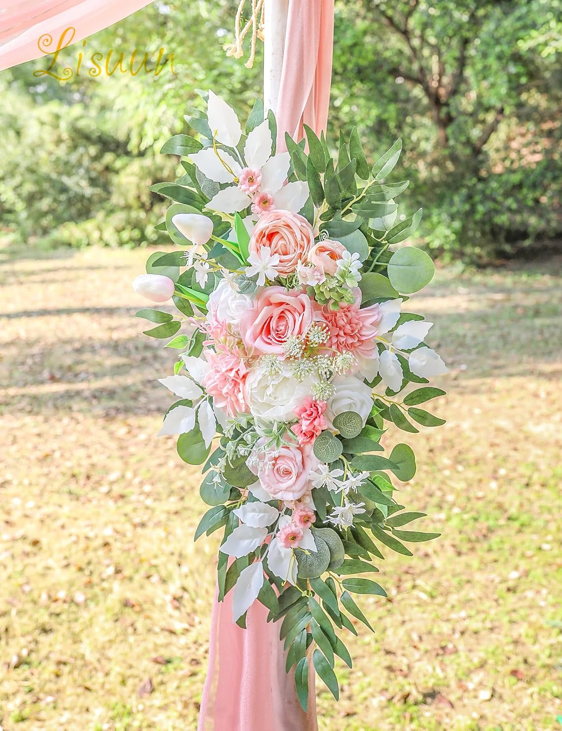 These looked great on the wedding arch. Beautiful in photos. Even though they’re fake flowers they weren’t cheap looking. Many ways offered to attach them to the arch. Please note these are just the flowers, no arch.