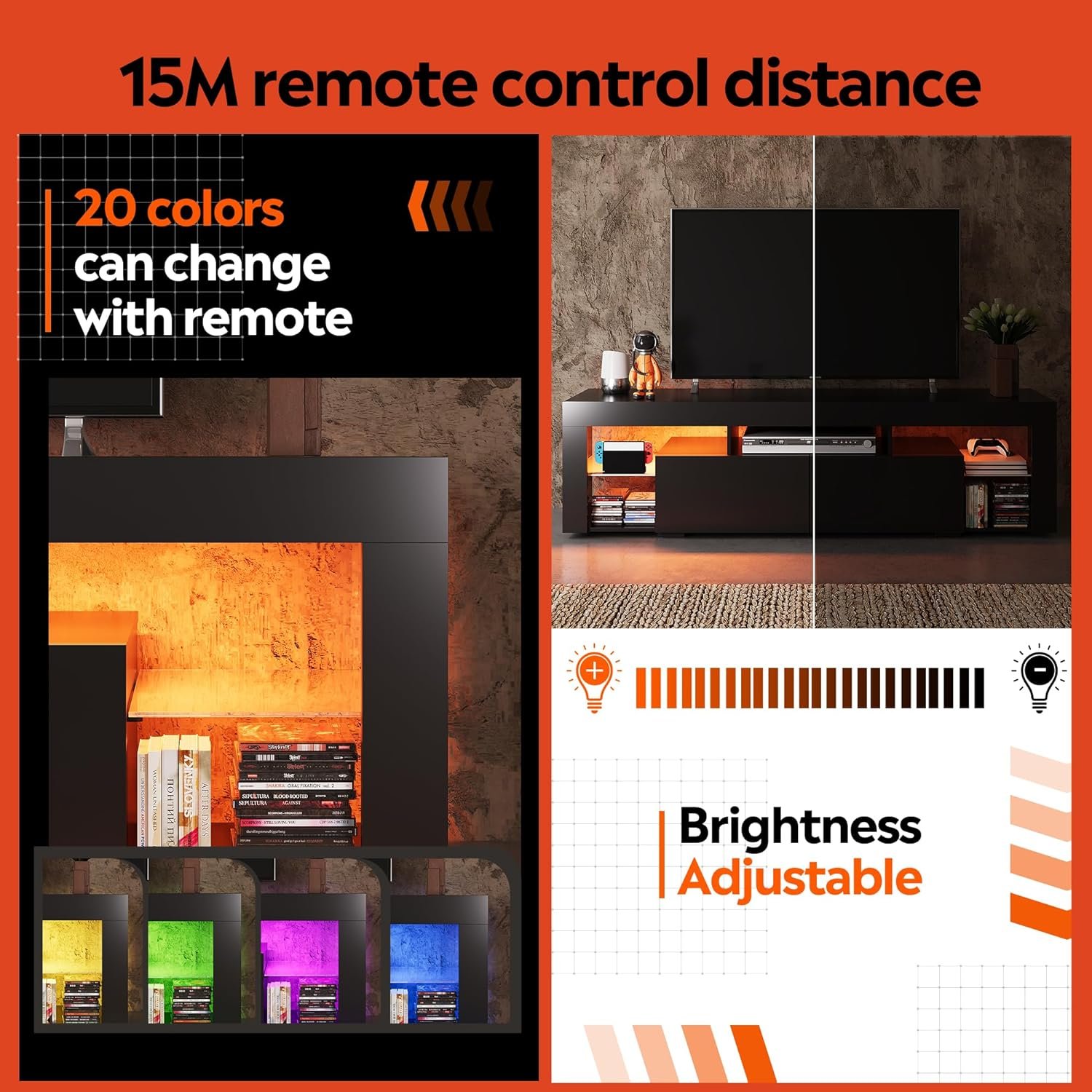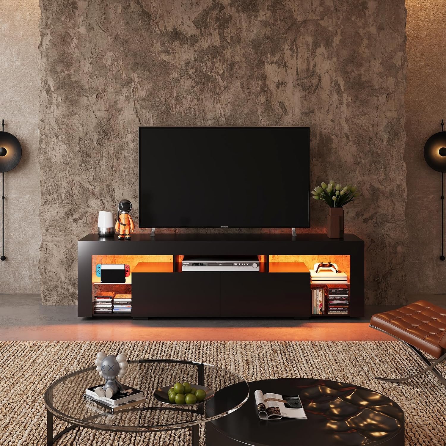 The WLIVE LED TV Stand is a true revelation in the world of home entertainment furniture. It seamlessly combines modern aesthetics with practical functionality, making it the centerpiece of my living room. This TV stand has completely elevated my TV-watching and gaming experience, and I can’t help but sing its praises. Here’s why I’m so impressed:Contemporary Elegance: This TV stand exudes contemporary elegance with its sleek design and black finish. It effortlessly complements any decor style, adding a touch of sophistication to my living space.Spacious and Versatile: The open shelves provide ample space for accommodating all my media equipment, including gaming consoles, DVD players, and sound systems. It’s designed to fit TVs ranging from 55 to 70 inches, offering versatility for various screen sizes.Storage Drawers: The inclusion of two storage drawers is a game-changer. They provide concealed storage for clutter, remote controls, gaming accessories, and more, helping me keep my living room organized and tidy.Glass Display Panel: The glass panel adds a modern touch and serves as a stylish display area for decorative items, family photos, or collectibles. It adds a personalized touch to the TV stand.Cable Management: The TV stand features cable management holes at the back, which keep wires and cables neatly organized and out of sight. This attention to detail enhances the overall aesthetics.Sturdy Build: The TV stand is robust and well-constructed. It can support the weight of my TV and equipment without any concerns, ensuring stability and safety.Easy Assembly: The straightforward assembly process made setting up the TV stand a breeze. Clear instructions and labeled parts ensured a hassle-free experience.Quality Materials: The use of high-quality materials guarantees durability and longevity. This TV stand is built to last, making it a worthwhile investment.Enhanced Ambiance: The built-in LED lights add an extra layer of ambiance to my viewing experience. They can be customized to set the mood or create a cinematic atmosphere during movie nights.In conclusion, the WLIVE LED TV Stand is a masterpiece of modern home entertainment furniture. Its contemporary design, spacious storage, cable management, and quality construction make it a standout product. Whether you’re setting up a home theater, gaming station, or simply upgrading your living room, this TV stand offers style and functionality in perfect harmony. I wholeheartedly recommend it; it’s a five-star addition that transforms your living space into an entertainment oasis!