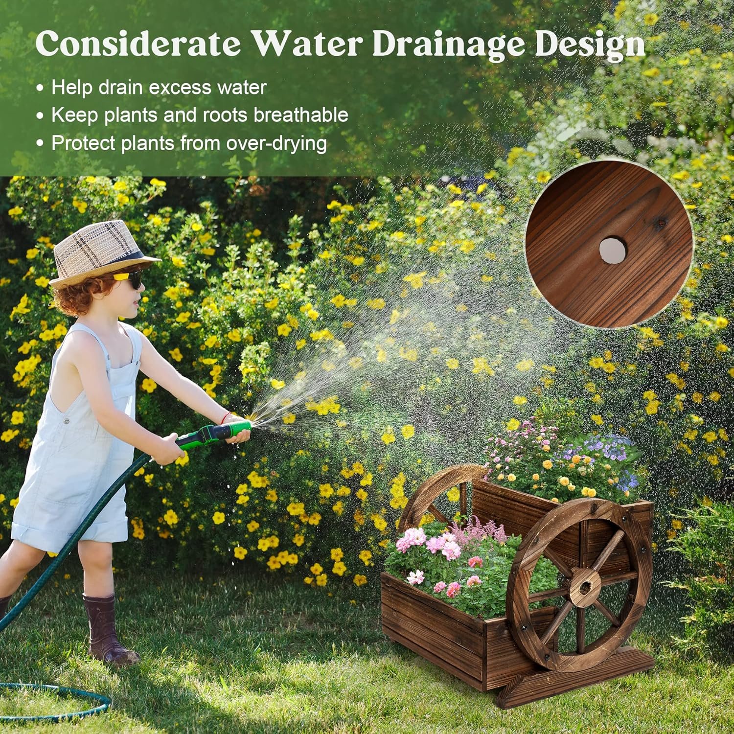 Wooden Wagon Planter Box, Garden Planter with Wheels,Decorative Planter for Flowers Herbs Vegetables for Indoor & Outdoor Décor, Flower Cart for Patio Garden Balcony