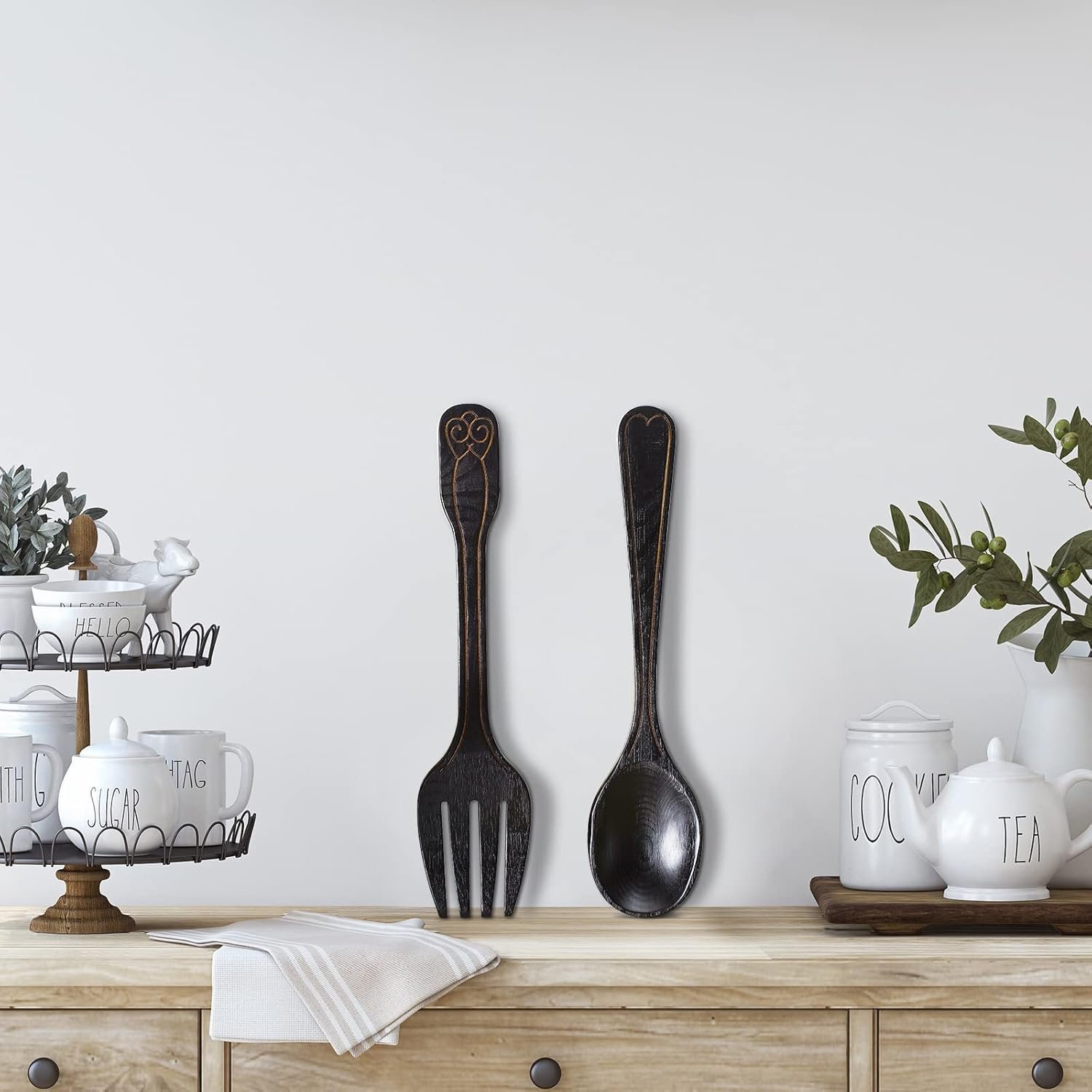 Yulejo Large Fork and Spoon Wall Decoration Rustic Kitchen Decoration 2 Pieces Wooden Spoon Wall Sign Fork Wall Art Farmhouse Wooden Sign for Home Kitchen Dining Room